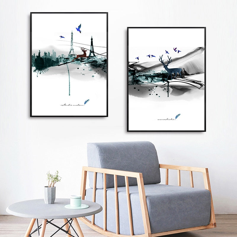 Abstract Paris Eiffel Tower Deer - Canvas Wall Art Painting