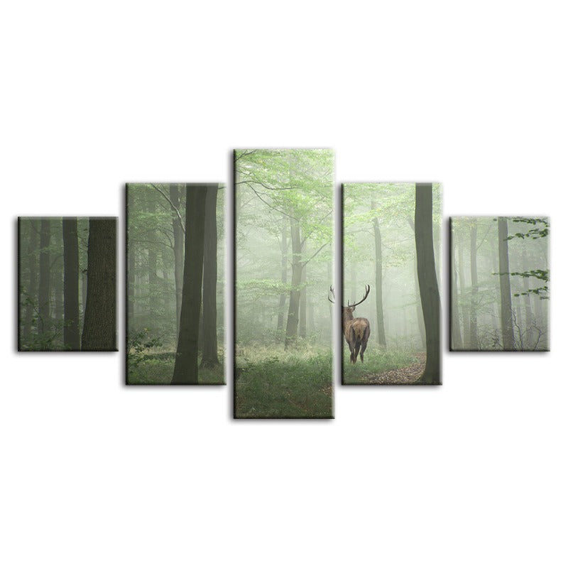 5 Piece Misty Mystical Deer In The Woods - Canvas Wall Art Paintings