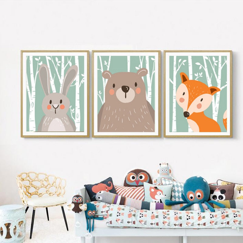 Woodland Animals Rabbit Fox Bear Nursery - Canvas Wall Art Painting