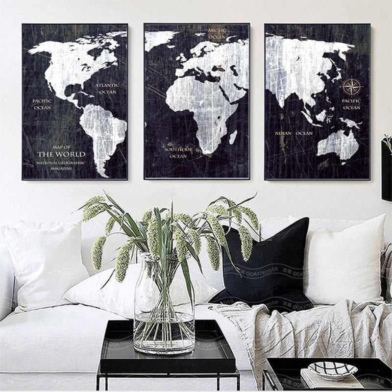 Vintage Black And White World Map Posters Prints - Canvas Wall Art Painting