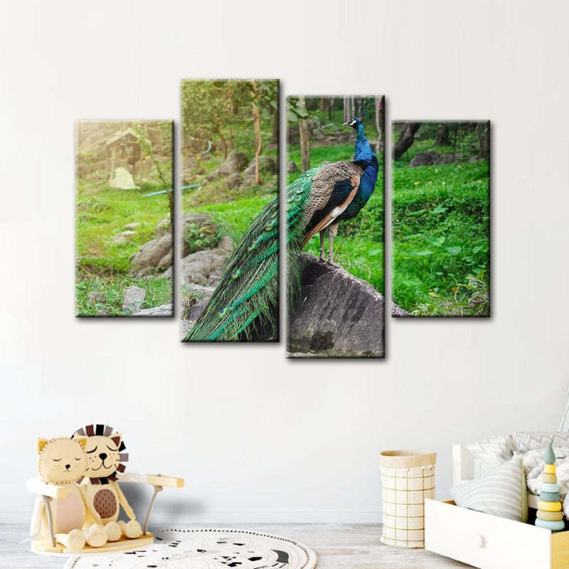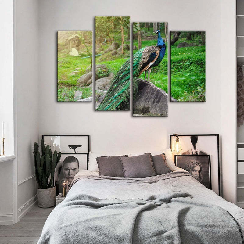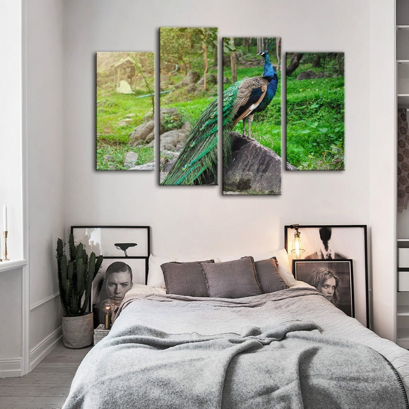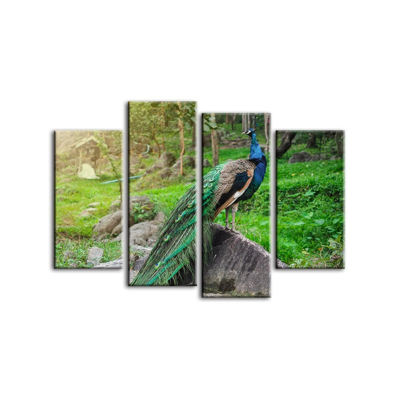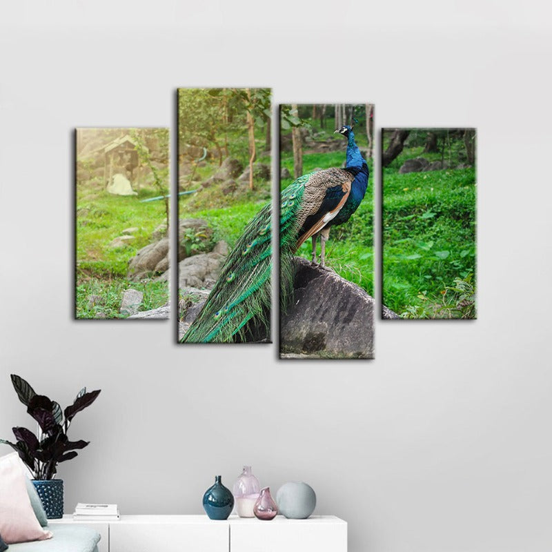 Dignified Sunlit Peacock 4 Piece - Canvas Wall Art Painting is a premium canvas that adds a peaceful touch to your décor. The canvas features a single peacock facing away from the viewer with its backlit by the sun.