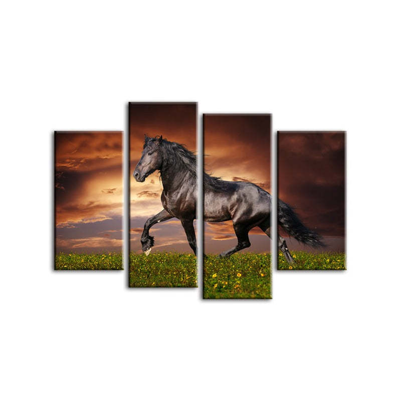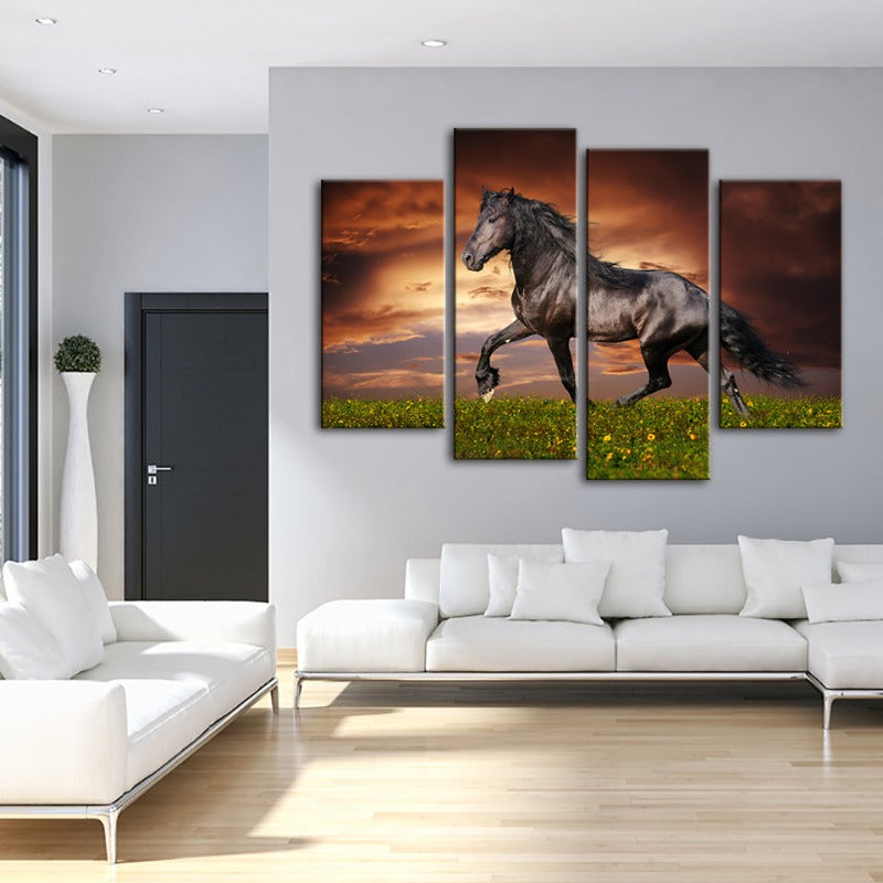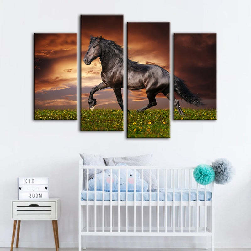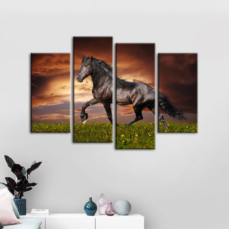 4 Piece Running Black Horse - Canvas Wall Art Painting is a premium canvas that adds a fresh touch to your decor. The Wall Art is perfect to decorate your bedroom, dining room, living room, office, dormitory, hotel lobby, and more! Mix and match your favorite pieces to create an eye-catching feature wall.