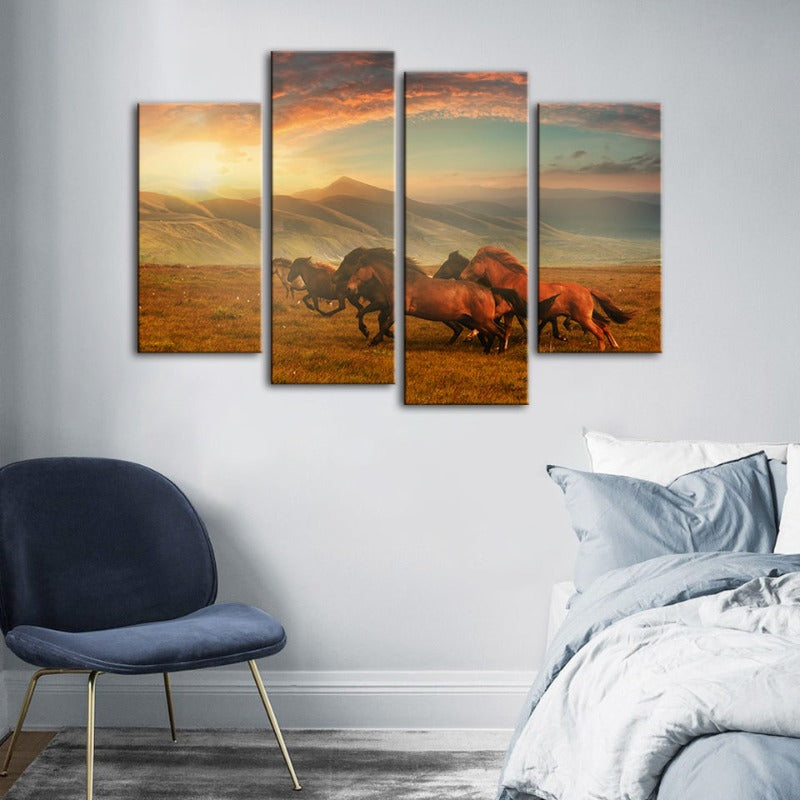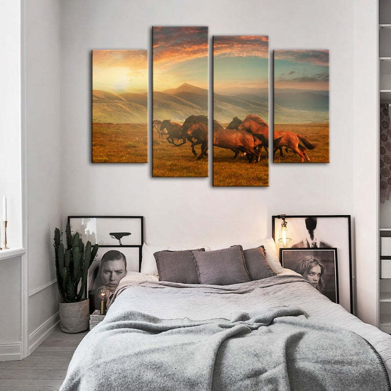 4 Piece Running Horses With Beautiful Landscape - Canvas Wall Art Painting is a premium canvas that adds a fresh touch to your decor. The Wall Art is perfect to decorate your bedroom, dining room, living room, office, dormitory, hotel lobby, and more! Mix and match your favorite pieces to create an eye-catching feature wall.