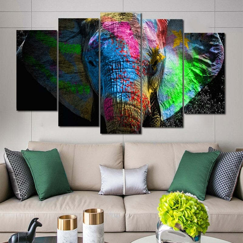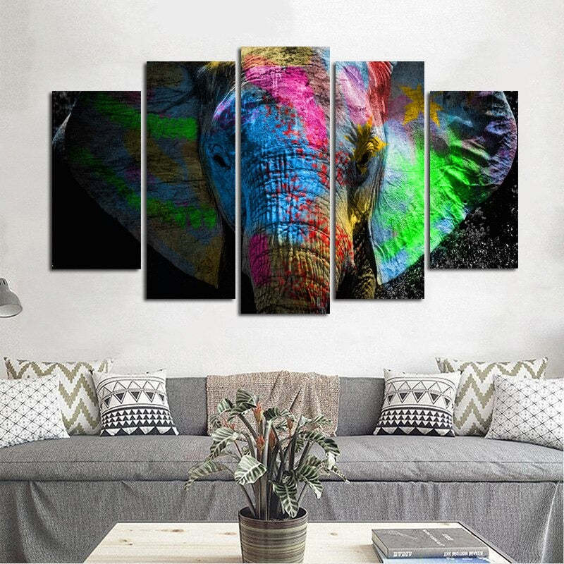 The set of 5 Panels "Colorful Animal Print"- Wall Art Modular Pictures Posters are made on high quality canvas with waterproof ink. So Bring a little bit of the jungle into your living room with these five brightly colored paintings of elephants. They are also ideal for a nursery or a child's room. They're the perfect addition to any space, especially those with more neutral colors.