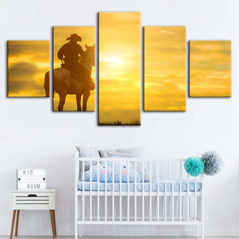 A Cowboy And His Steed 5 Piece - Canvas Wall Art Painting is a premium canvas that adds a peaceful touch to your décor. The canvas features a cowboy and his horse standing watching a gold-tinted sunset.