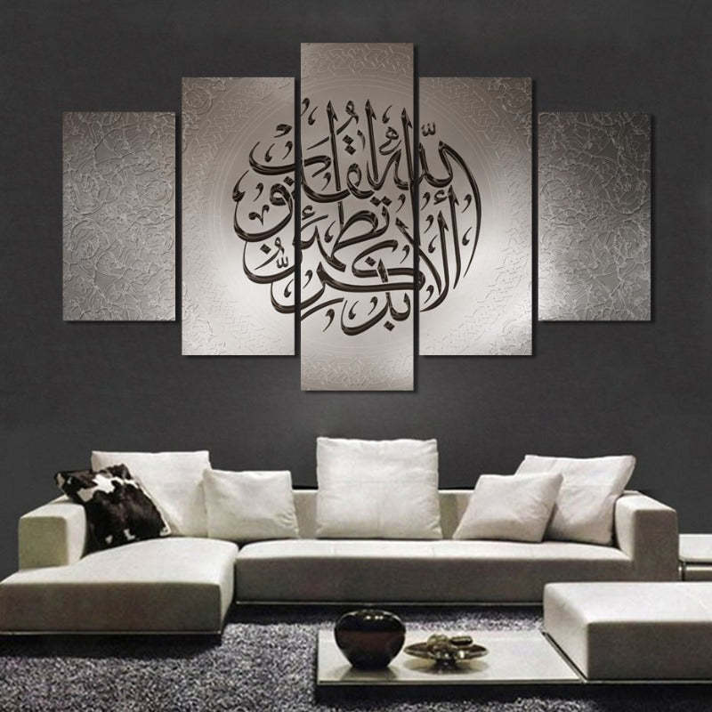 5 Piece Abstract Islamic Calligraphy - Canvas Wall Art Painting is a premium canvas that brings life to your décor. The canvas features an illustration of a close-up of beautiful Islamic calligraphy across five canvases. This is great to place in a bedroom, living room, or dining room.