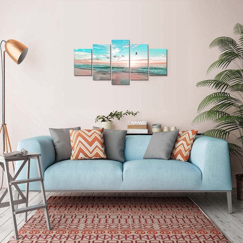 5 Piece Beach Sunset Landscape Canvas Wall Art Painting can be hung wherever you feel like it, it will brighten up the look of the space. It is divided into five frames of three different sizes which is useful to give a nice visual effect. You can hang it very easily since it has a hook mounted to it.