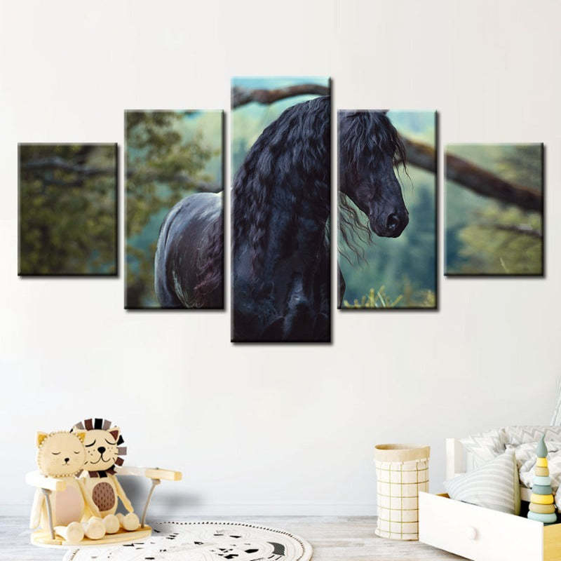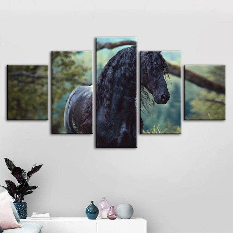 5 Piece Black Horse in Forest - Canvas Wall Art Painting is a premium canvas that brings life to your décor. The canvas features an illustration of a horse across five canvases. This is great to place in a bedroom, living room, or dining room.