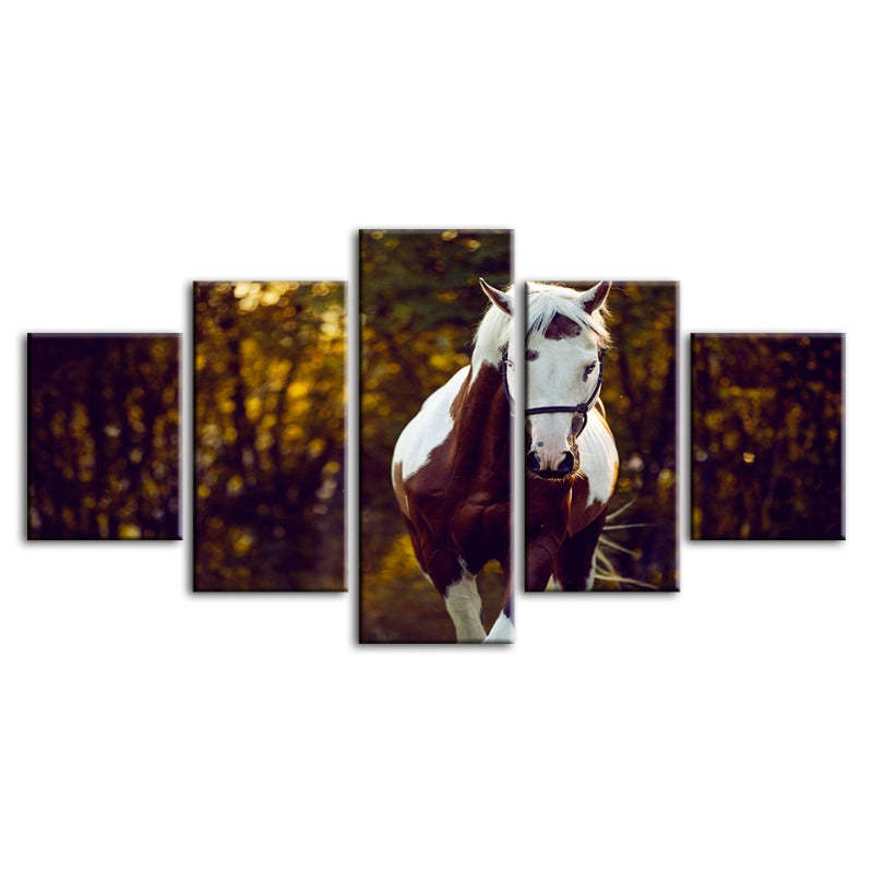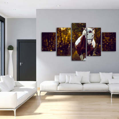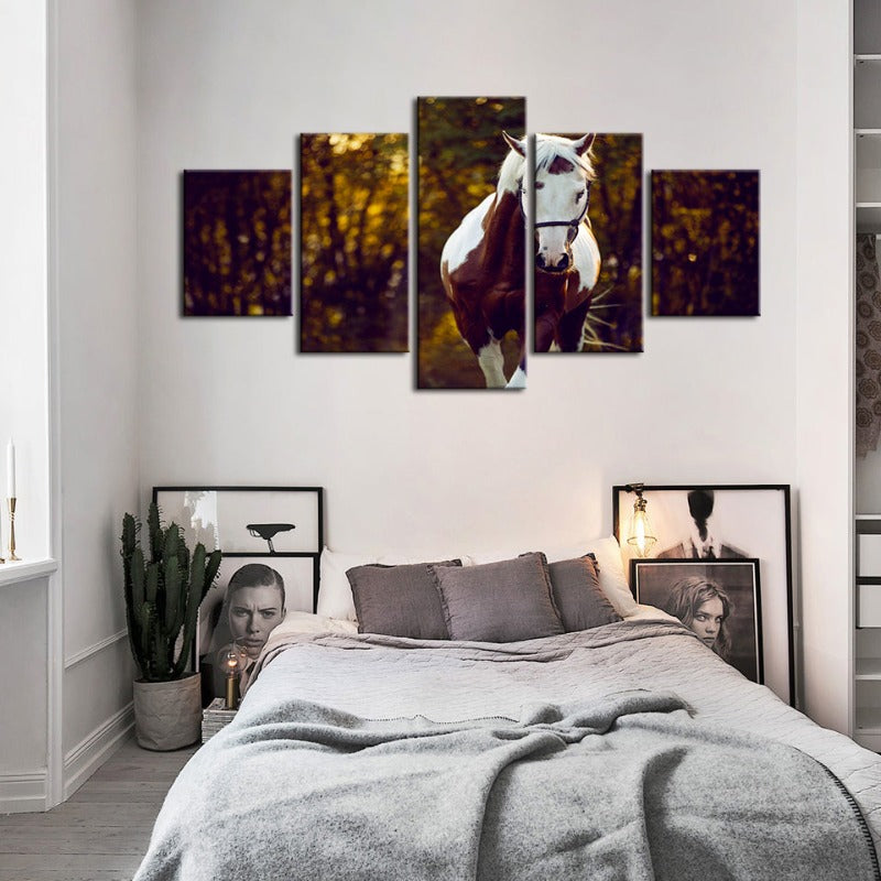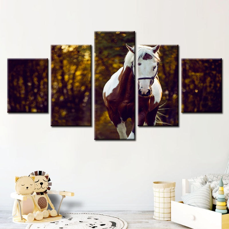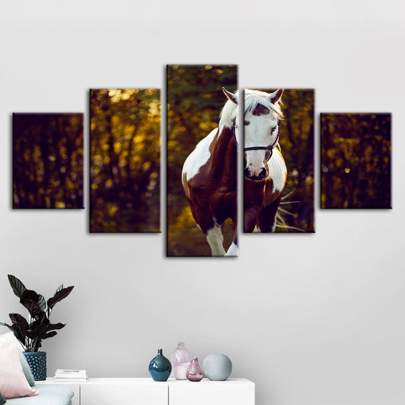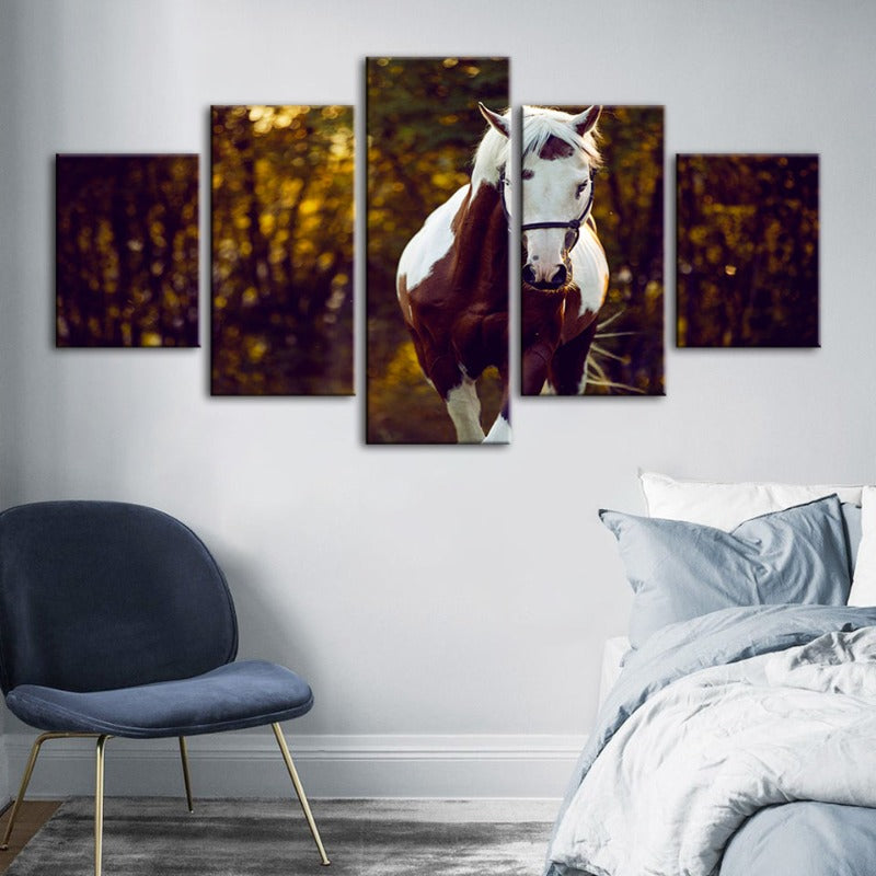 Courtly Overo Horse 5 Piece - Canvas Wall Art Painting is a premium canvas that adds a peaceful touch to your décor. The canvas features a beautiful brown and white Over-coated horse, taking a calming stroll through the woods.