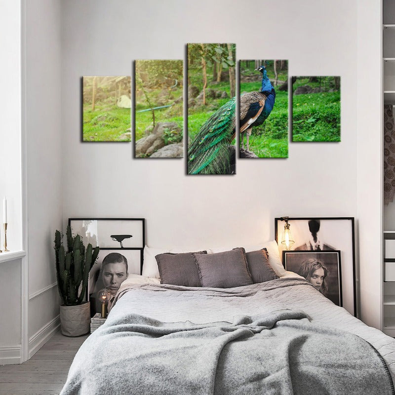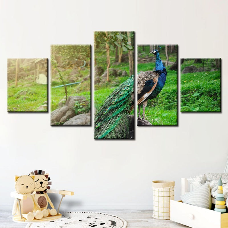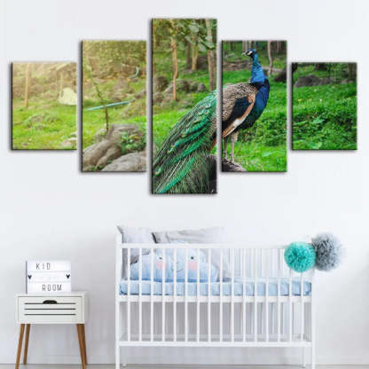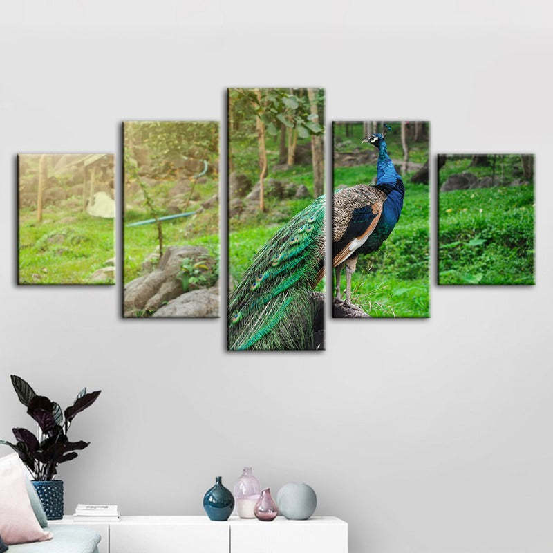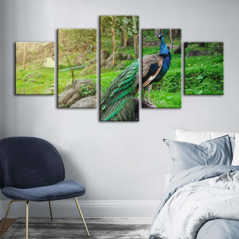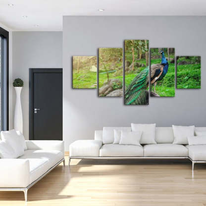 Dignified Sunlit Peacock 5 Piece - Canvas Wall Art Painting is a premium canvas that adds a peaceful touch to your décor. The canvas features a single peacock facing away from the viewer with its backlit by the sun.