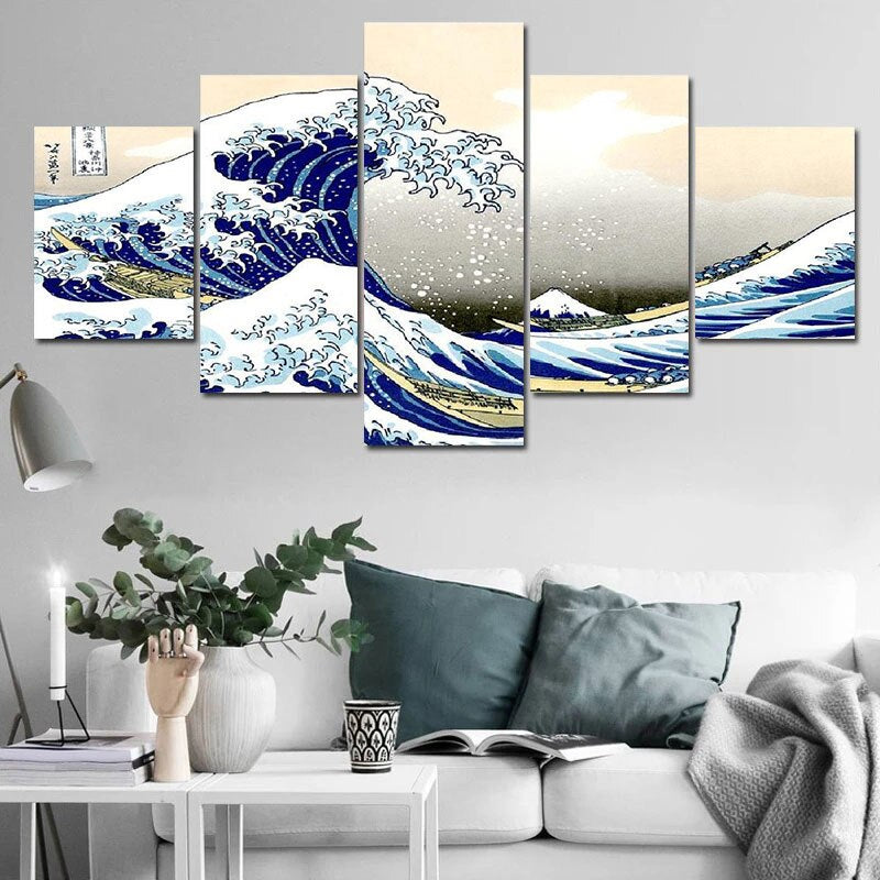 The 5 Piece Hokusai Kanagawa Big Flyer - Canvas Wall Art Painting is a great decoration for any room. The art is printed on a large piece of canvas and features the art of Hokusai. The art is a beautiful depiction of the coast and sea, with a wave crashing on the shore. The art can be hung on the wall or displayed on a table or shelf.