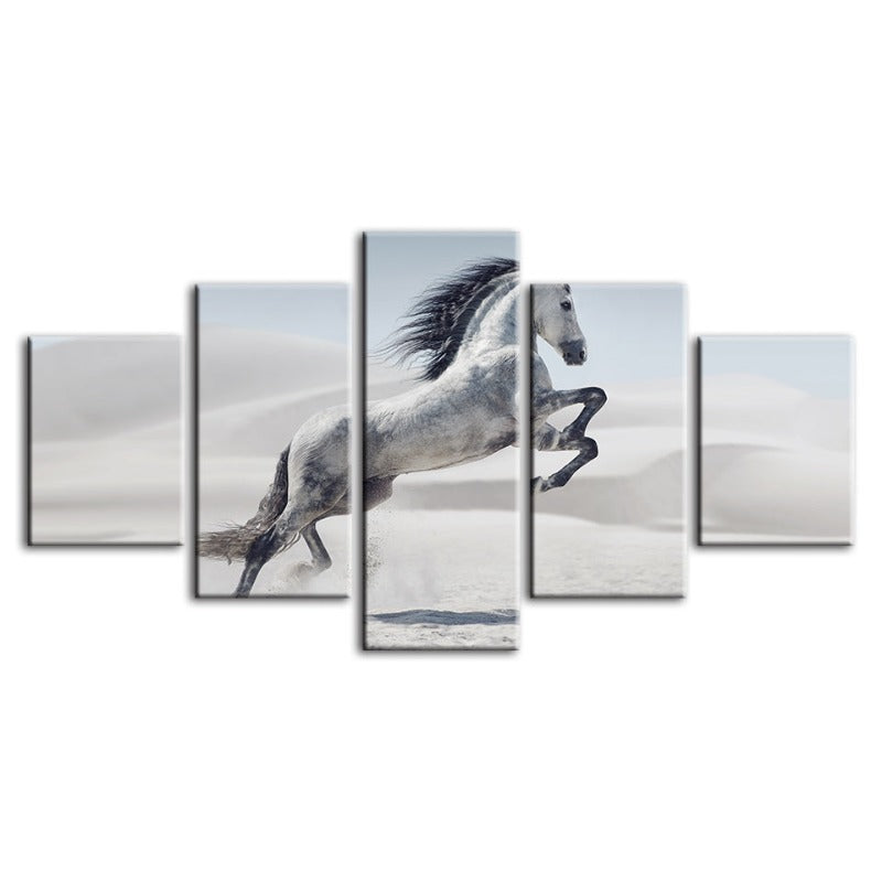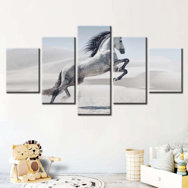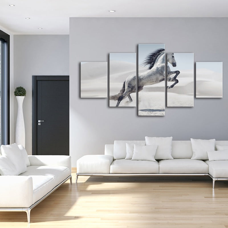5 Piece Jumping White Horse - Canvas Wall Art Painting is a premium canvas that brings life to your décor. The canvas features an illustration of a horse across five canvases. This is great to place in a bedroom, living room, or dining room.