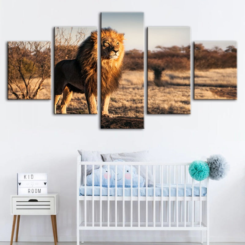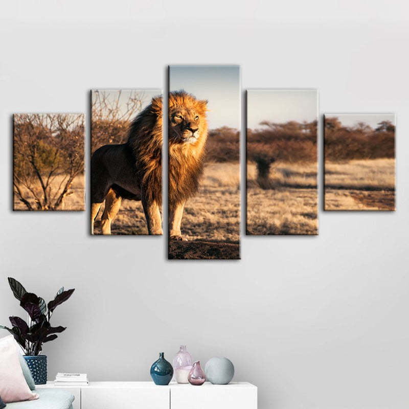 5 Piece Majestic Lion Bathed In Sunlight - Canvas Wall Art Paintings a premium canvas that adds a peaceful touch to your décor. The canvas features a lone majestic lion standing facing a rising sun on the plains.