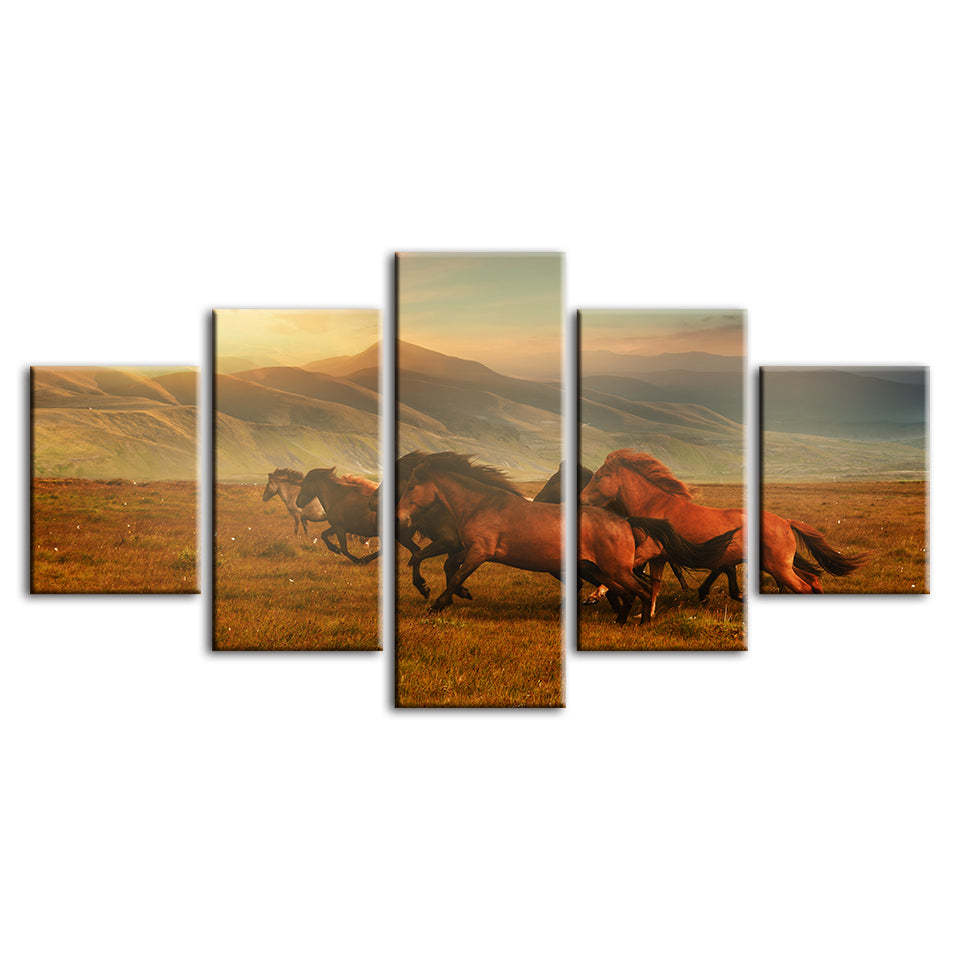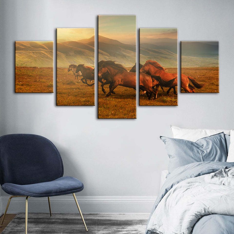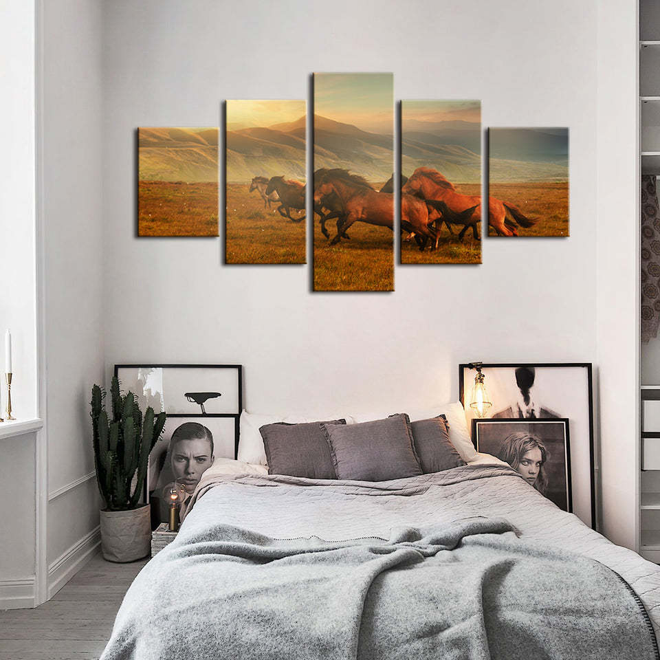 5 Piece Running Horses With Beautiful Landscape - Canvas Wall Art Painting is a premium canvas that brings life to your décor. The canvas features an illustration of a horse across five canvases. This is great to place in a bedroom, living room, or dining room.