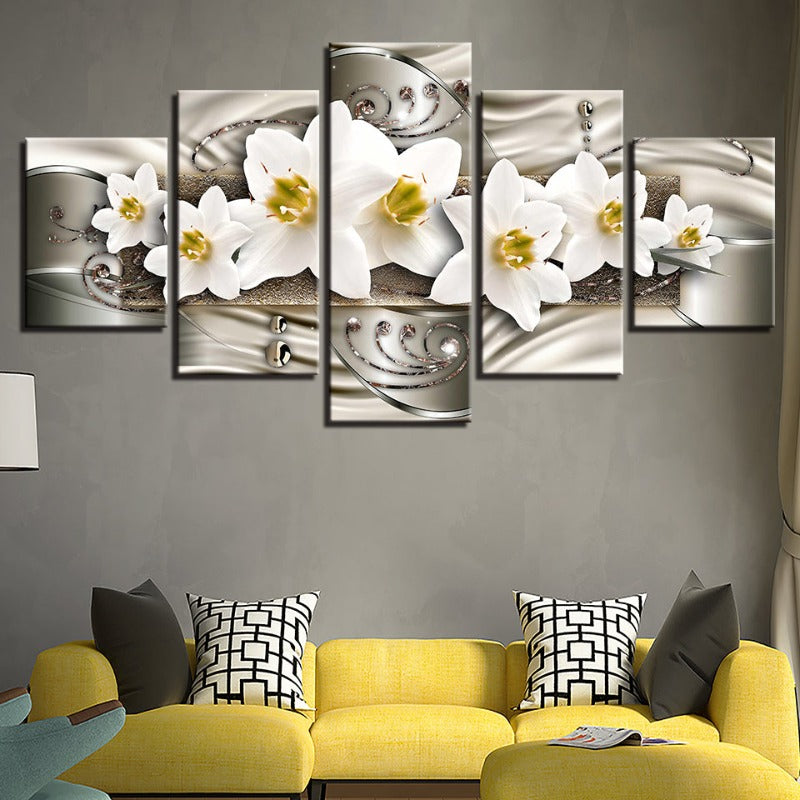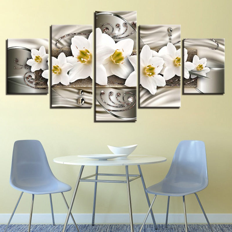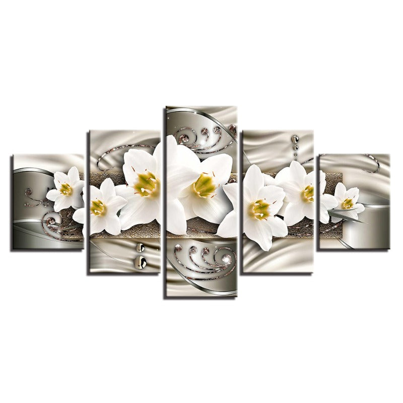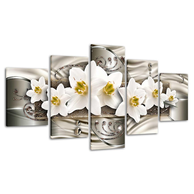 5 Piece Silver Background White Flower - Canvas Wall Art Painting is a premium canvas that brings life to your décor. The canvas features an illustration of a close-up of a pretty flower across five canvases. This is great to place in a bedroom, living room, or dining room.