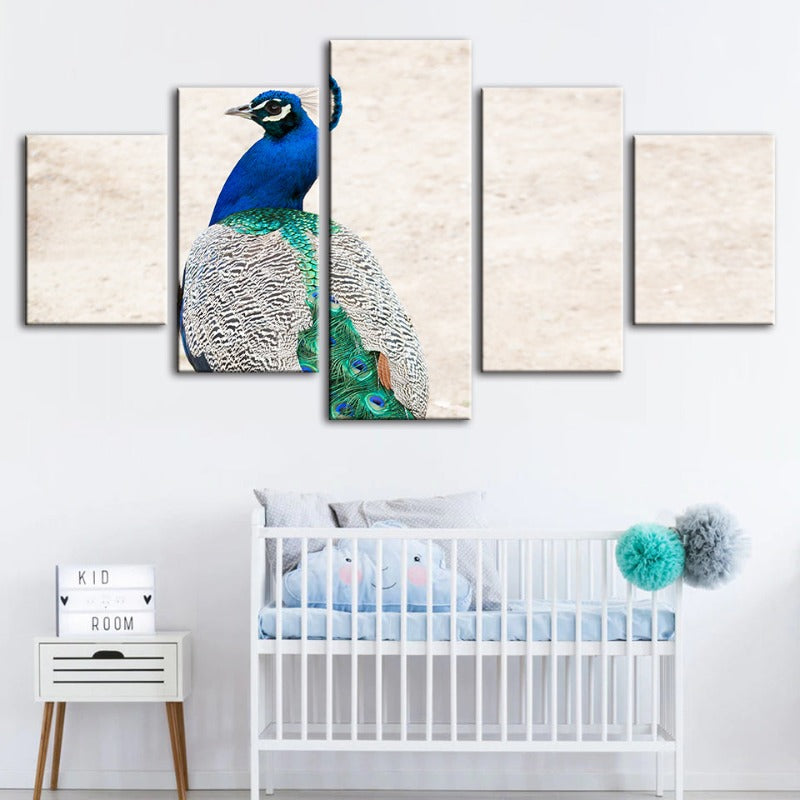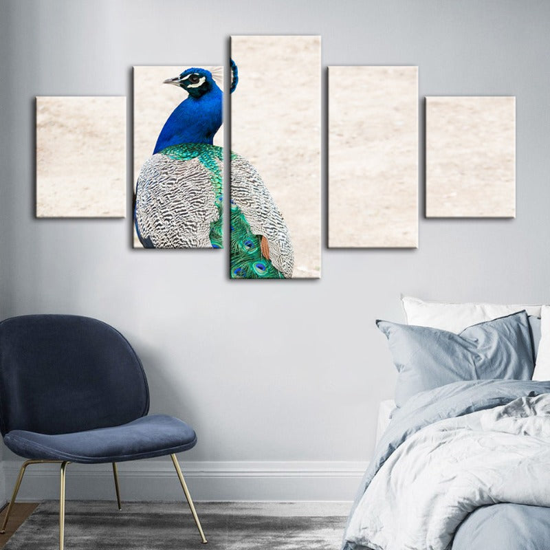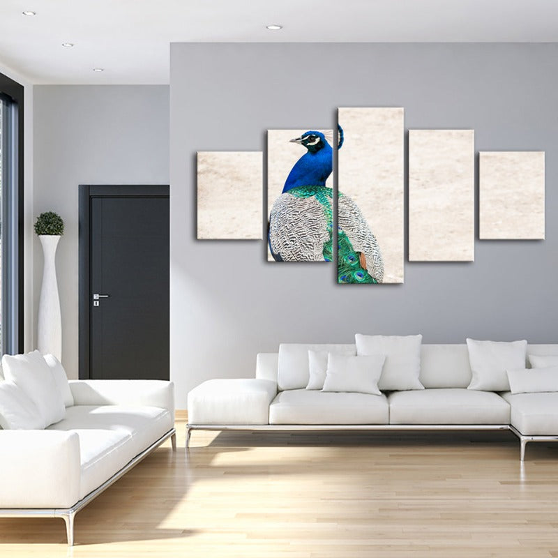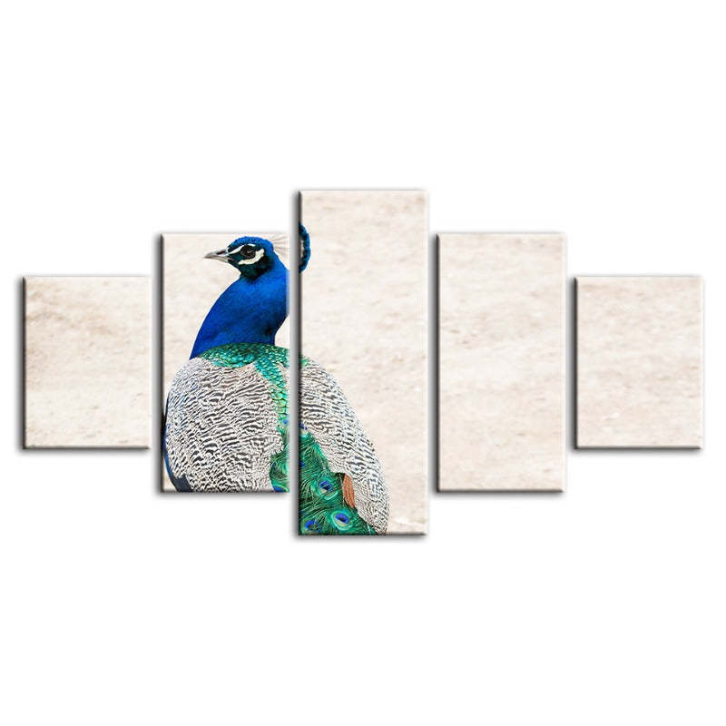 Skirted Elegant Peacock 5 Piece - Canvas Wall Art Painting is a premium canvas that adds a peaceful touch to your décor. The canvas features a peacock from behind with it's elegant tail feathers down and trailing behind it like a skirt.