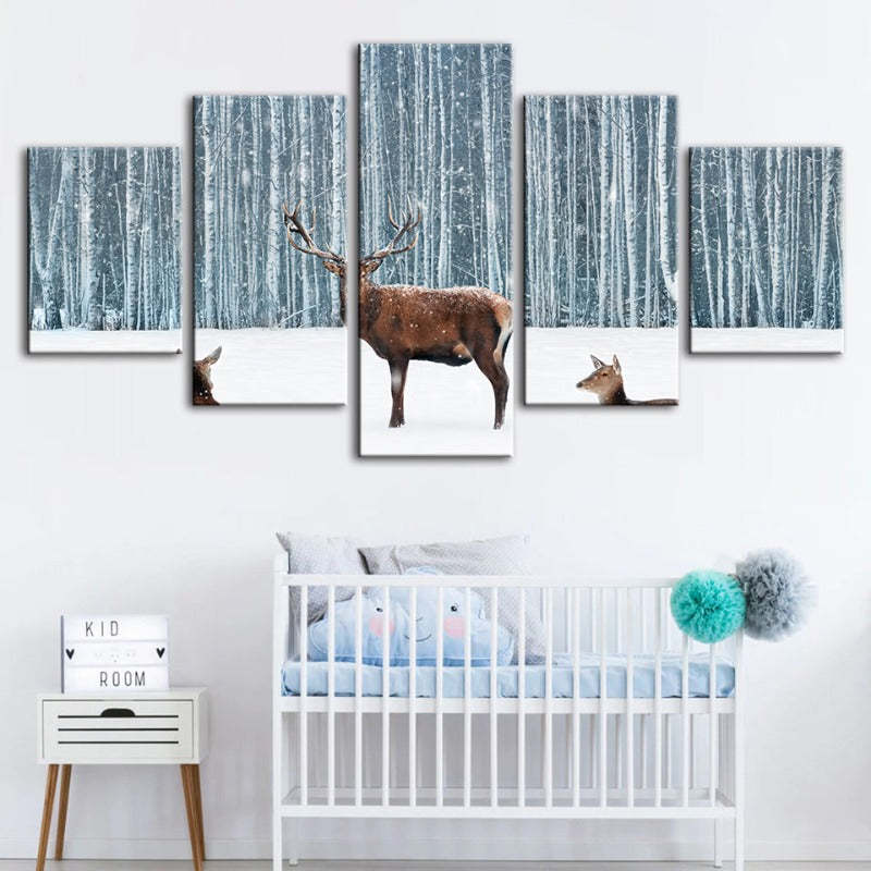 Two Does and a Deer in Winter 5 Piece - Canvas Wall Art Painting is a premium canvas that adds a peaceful touch to your décor. The canvas features a winter scene of a male deer standing guarding two do as they rest in a field of snow.