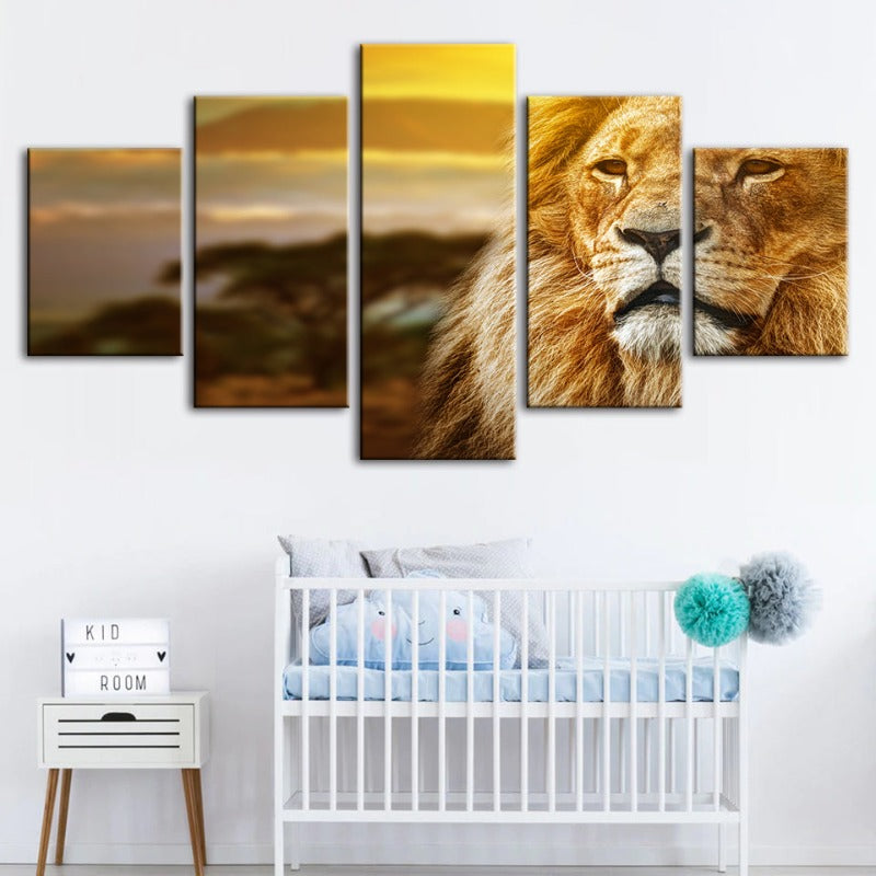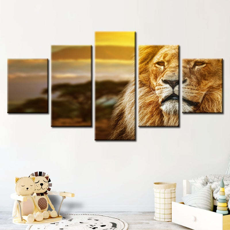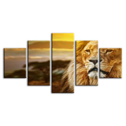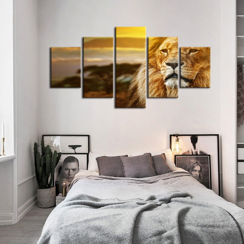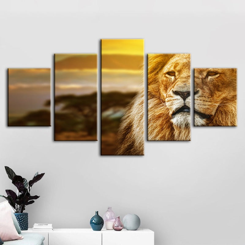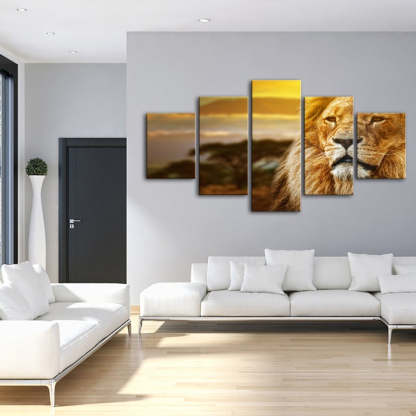 Unamused Lion 5 Piece - Canvas Wall Art Painting is a premium canvas that adds a peaceful touch to your décor. The canvas features the portrait of a lone lion backlit by sun with an extremely unamused expression on his face.