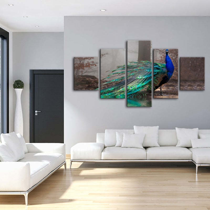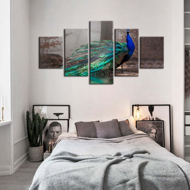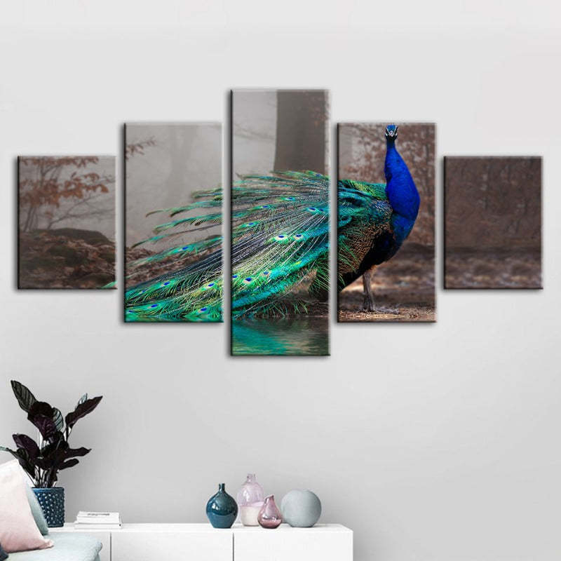 Vivid Peacock by the Pond 5 Piece - Canvas Wall Art Painting is a premium canvas that adds a peaceful touch to your décor. The canvas features a majestic peacock with it's vibrant color pattern making it pop against the dull forest and pond backdrop.