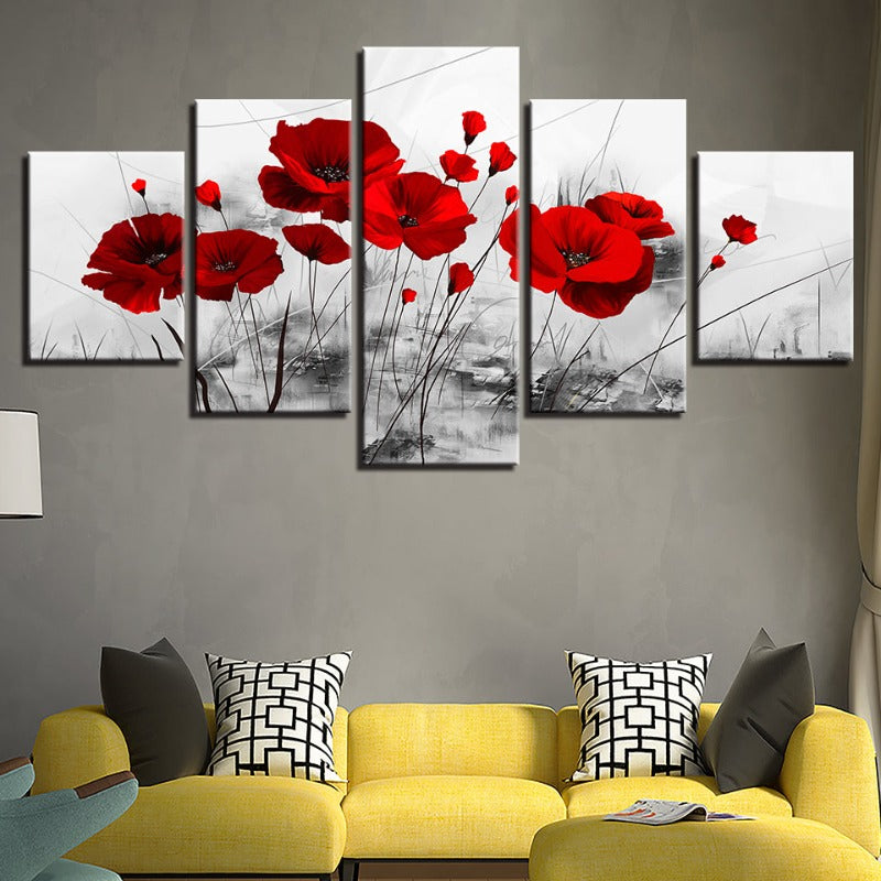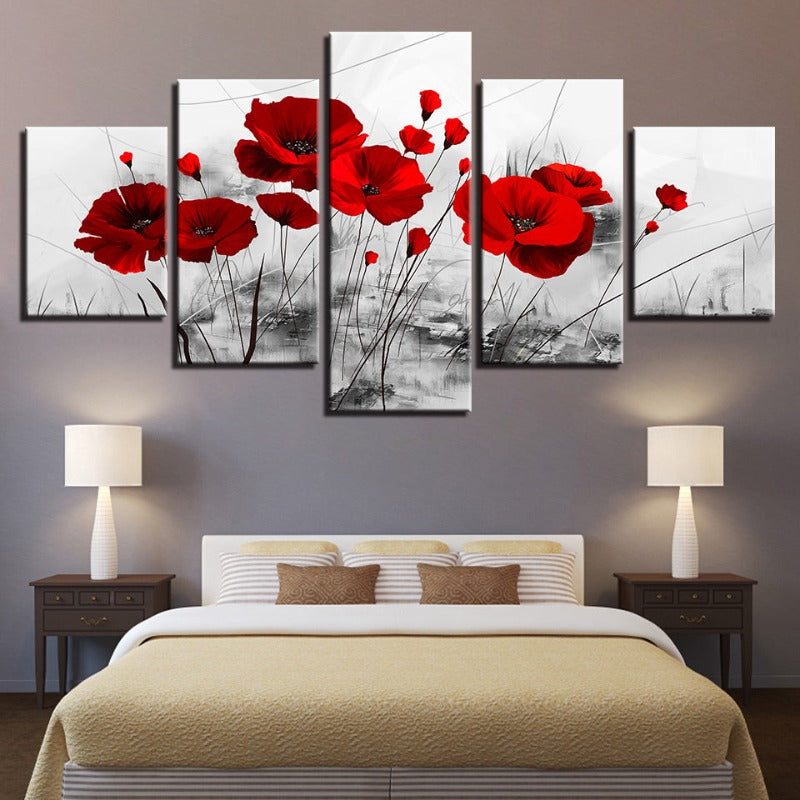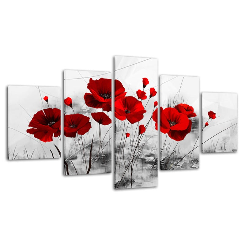 5 Piece White Background Red Flower - Canvas Wall Art Painting is a premium canvas that brings life to your décor. The canvas features an illustration of a close-up of a pretty flower across five canvases. This is great to place in a bedroom, living room, or dining room.