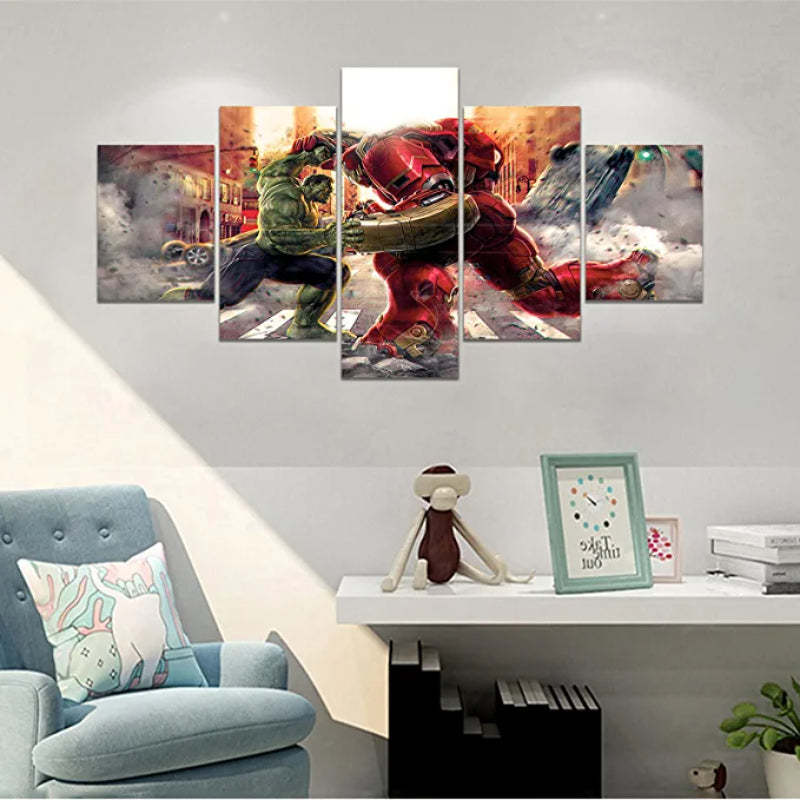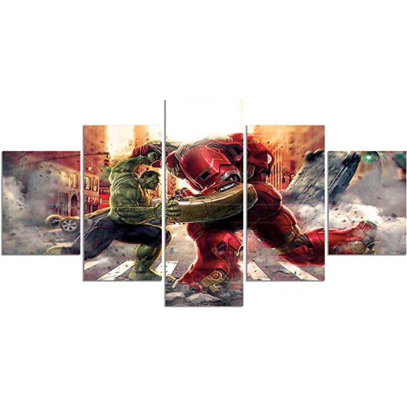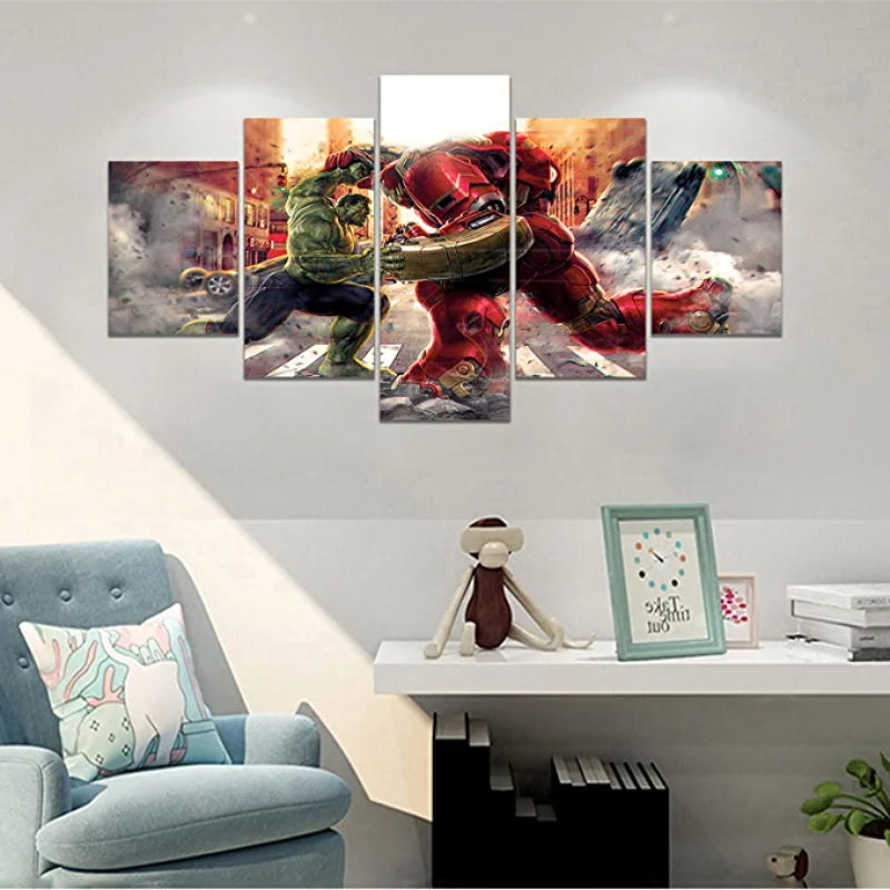 5 Pieces Hulk Vs Iron Man Canvas Painting features the legendary fight of hulk and iron man. This canvas is a great gift for your relatives and friends that will bring a wide smile to their faces. It is a canvas that has a hook mounted on it making it easy to hang wherever you want.