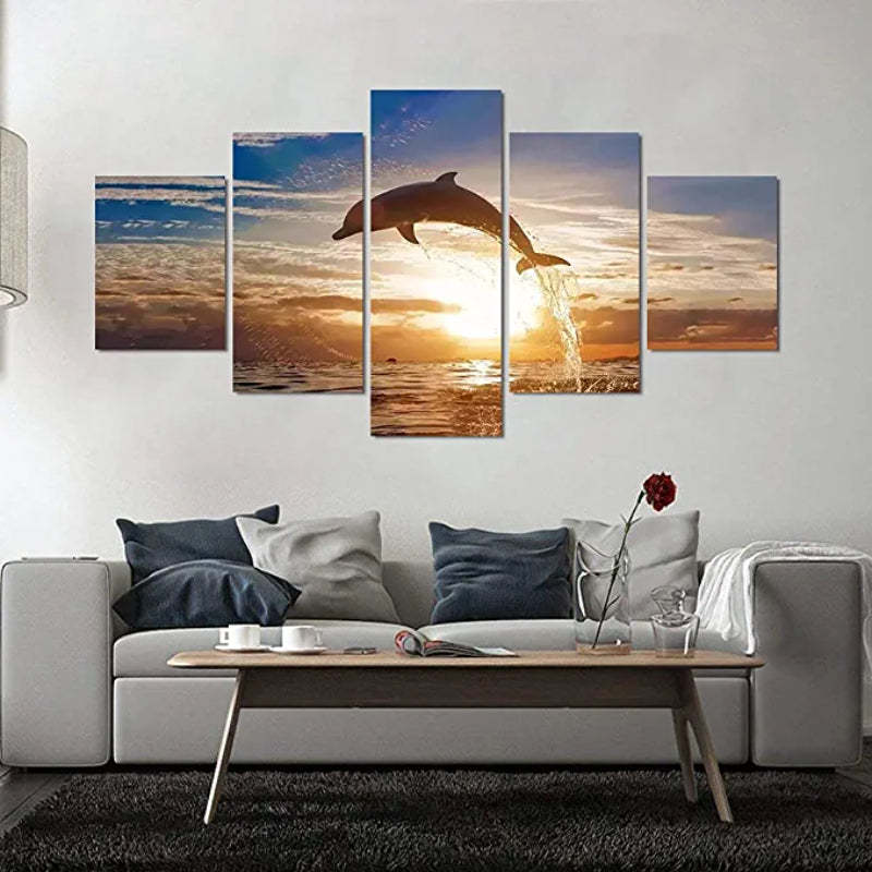 Give your home some excitement with this stunning art print collection featuring five incredible designs with 5 Pieces Jumping Dolphin Sunset Landscape Painting. These beautiful marine art prints are painted by hand on a premium-grade canvas that's water-resistant and eco-friendly. This is also an amazing choice for a gift!!!