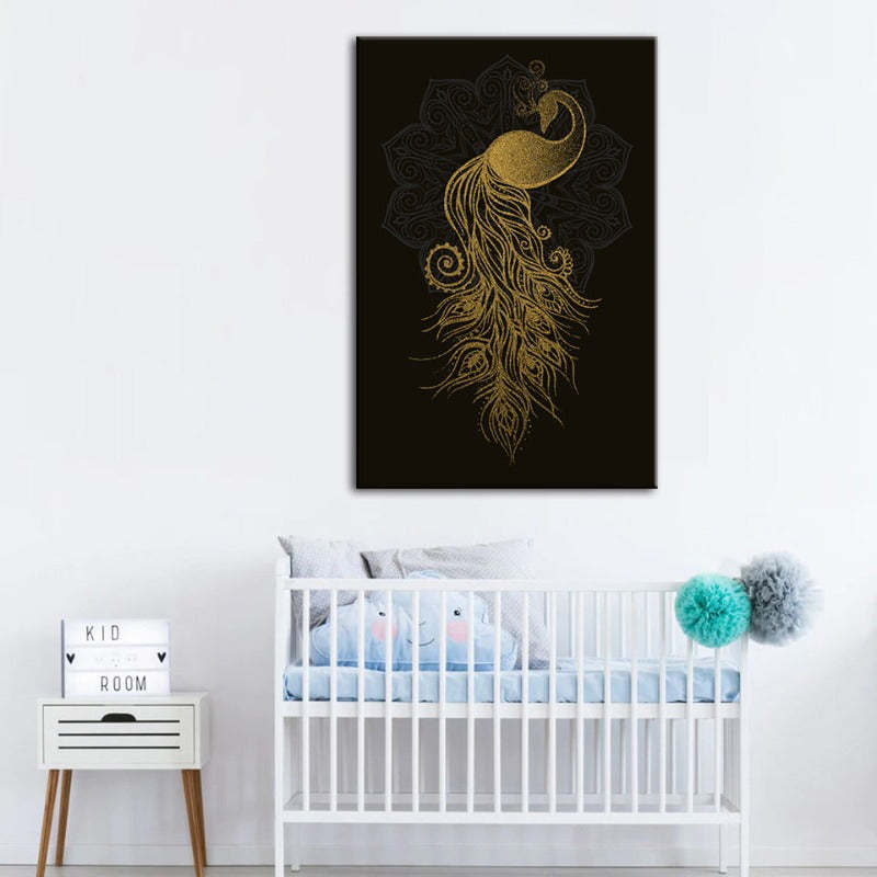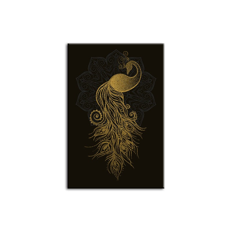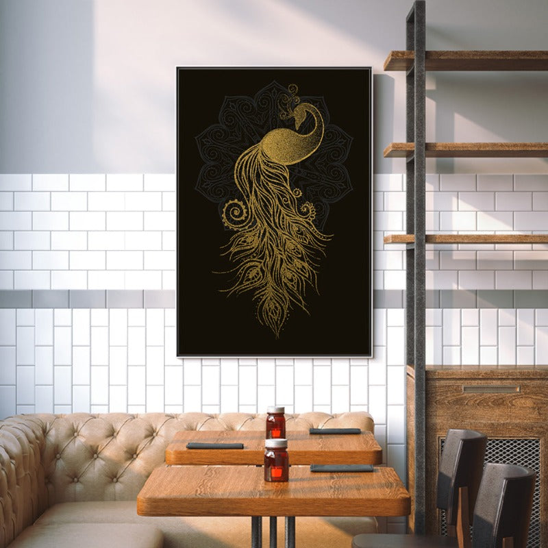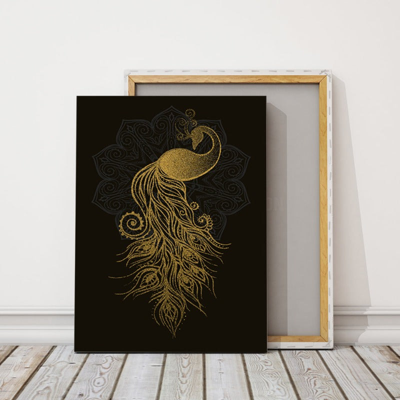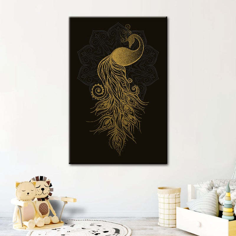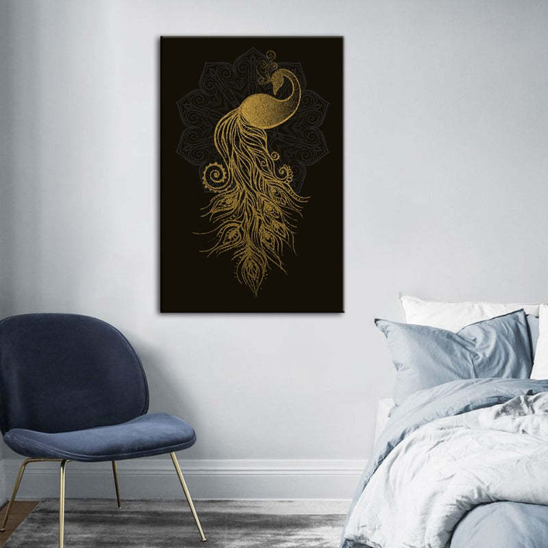 Abstract Golden Mandala Peacock - Canvas Wall Art Painting is a premium canvas that adds a touch of wild life art to your décor. The canvas features a golden Mandala like pattern of an abstract peacock. The Wall Art is perfect to decorate your bedroom, dining room, living room, office, dormitory, hotel lobby, and more! Mix and match your favorite pieces to create an eye-catching feature wall.
