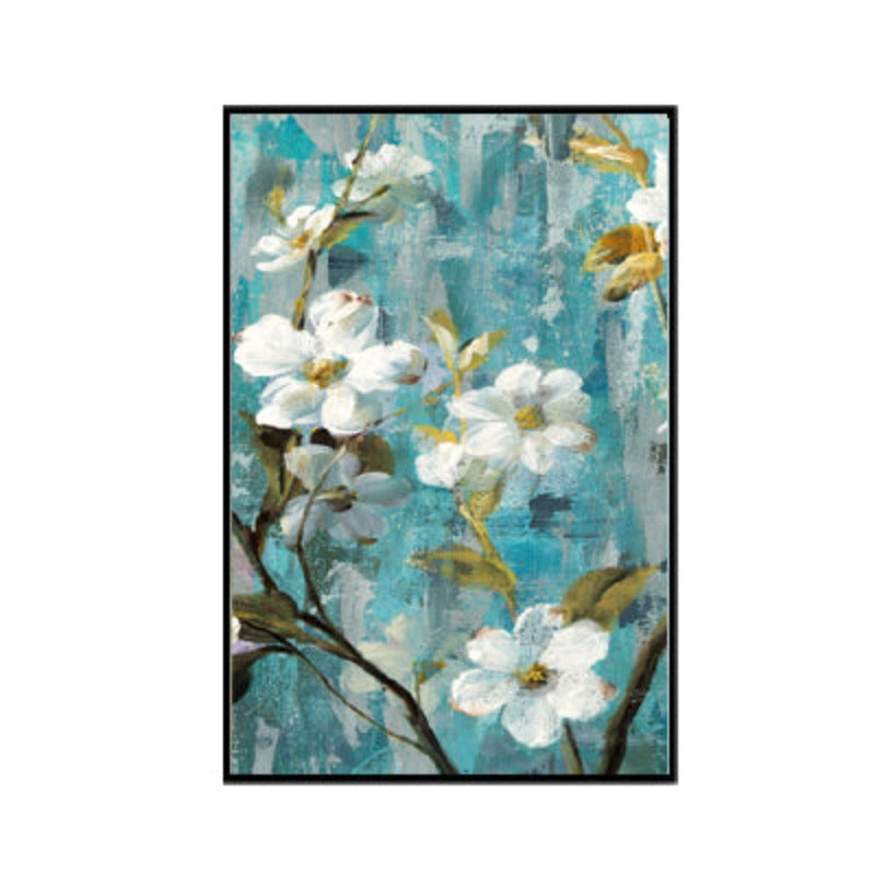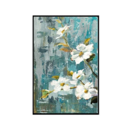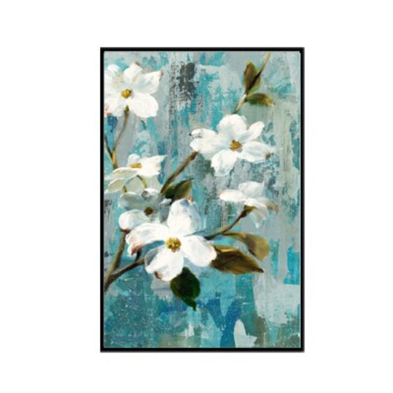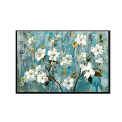 Apple White Flower Pictures - Canvas Wall Art Painting is a premium canvas with blue background and white color flowers painted on it. It is a great piece of decor for a home or workplace and can be a perfect gift for art and nature lovers. It will add aesthetic to any place and enhance the look of the space.