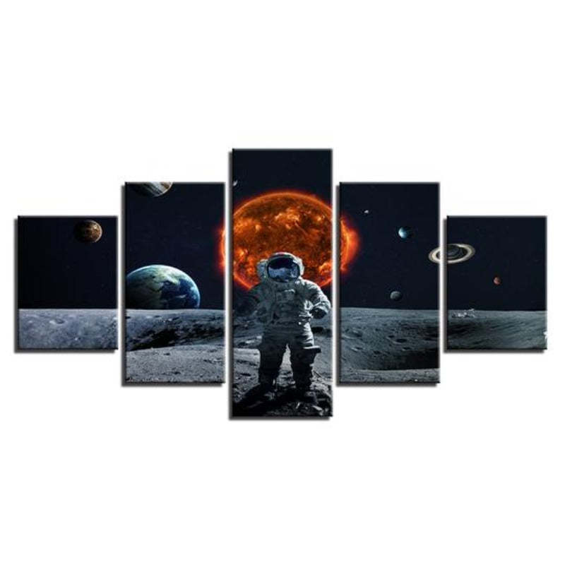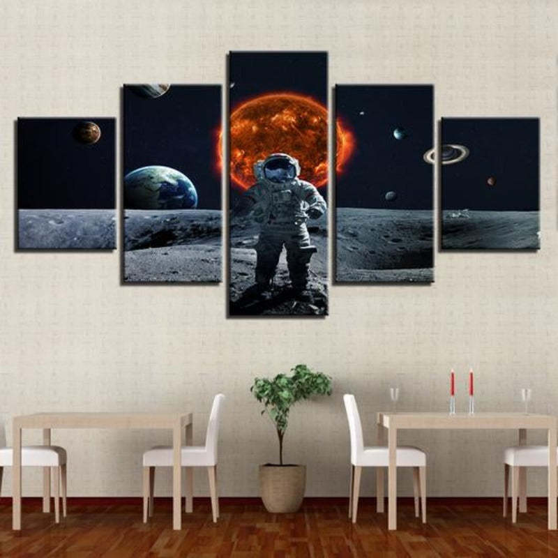Astronaut In Space - Canvas Wall Art Painting is a premium canvas that brings outer space to your décor. The canvas features a big solar system scene with many different planets with an astronaut standing right in front. This is great to place in a dining room, living room, or bedroom.