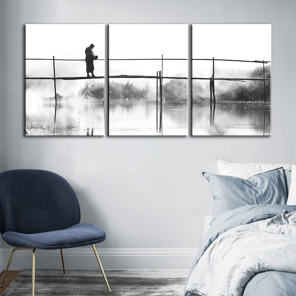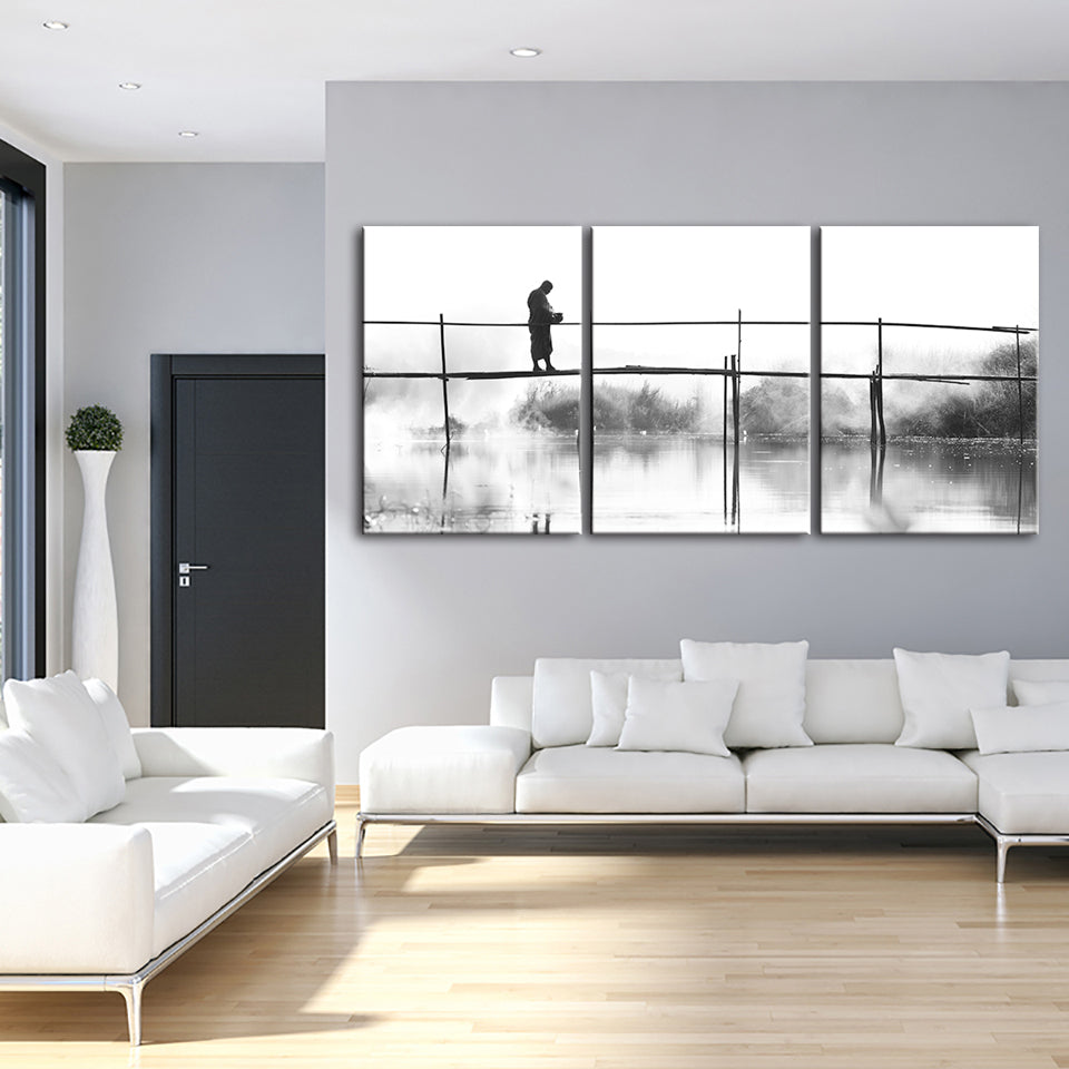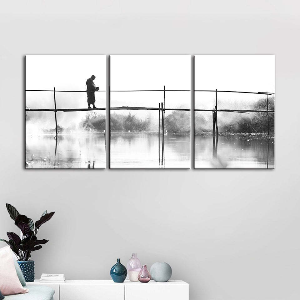Bridge Walking 3 Piece - Canvas Wall Art Painting is a premium canvas that adds a peaceful touch to your decor. The canvas features a black and white-themed canvas with a person walking across a tall bridge.