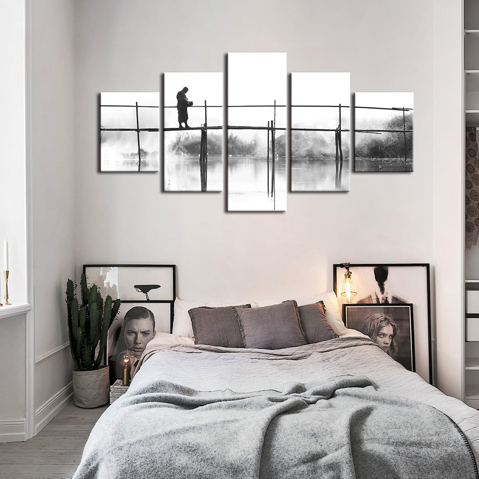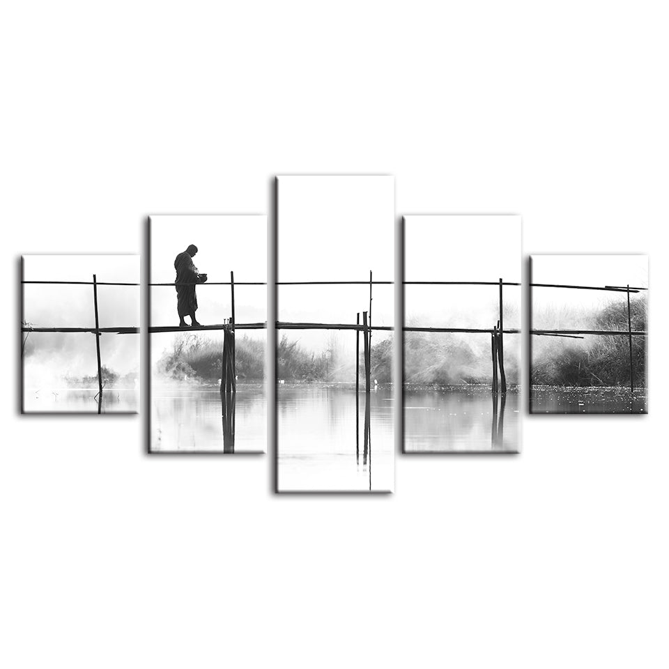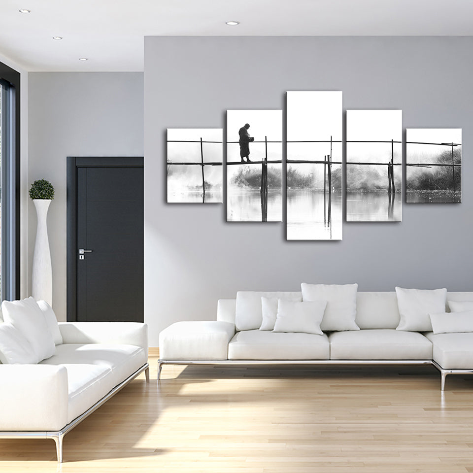 Bridge Walking 5 Piece - Canvas Wall Art Painting is a premium canvas that adds a peaceful touch to your decor. The canvas features a black and white-themed canvas with a person walking across a tall bridge.