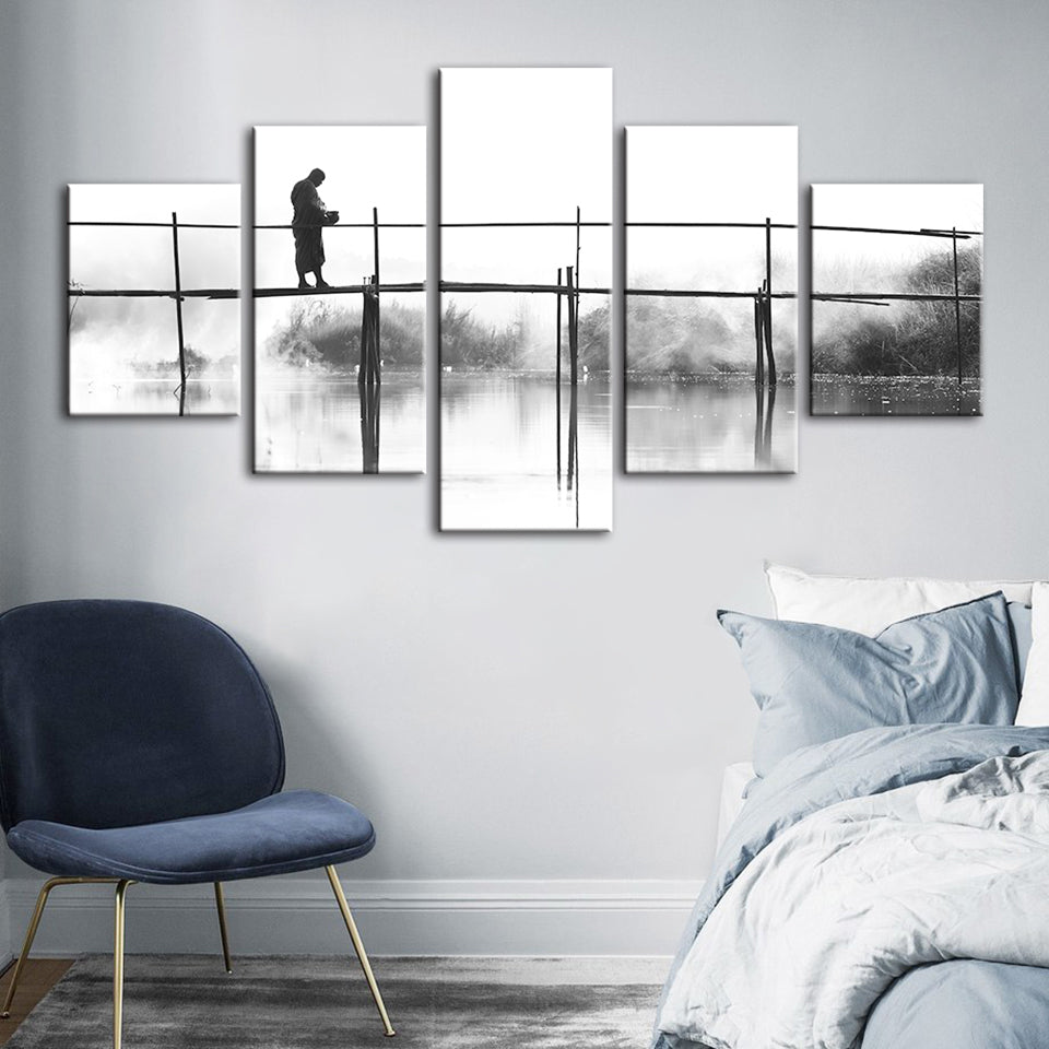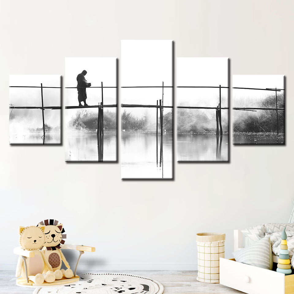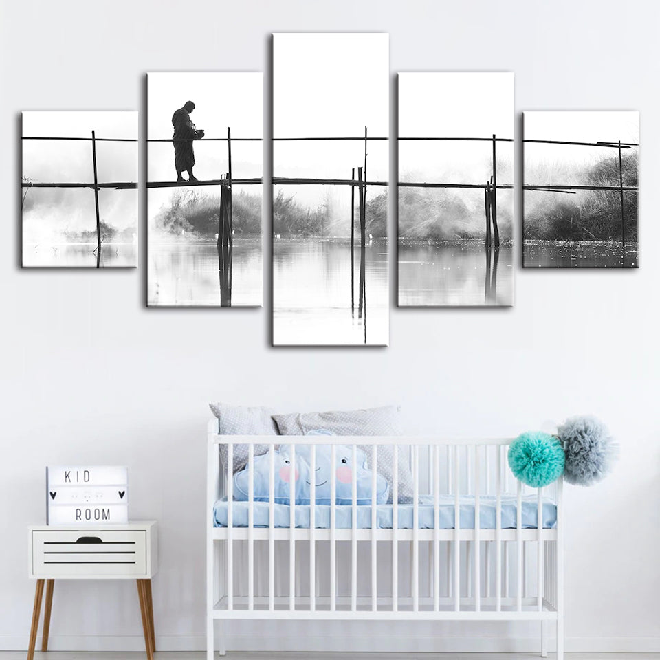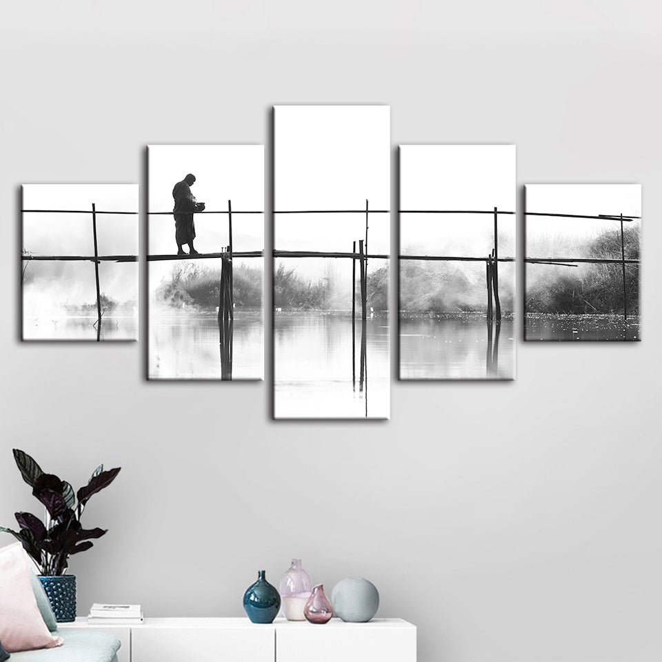 Bridge Walking 5 Piece - Canvas Wall Art Painting is a premium canvas that adds a peaceful touch to your decor. The canvas features a black and white-themed canvas with a person walking across a tall bridge.