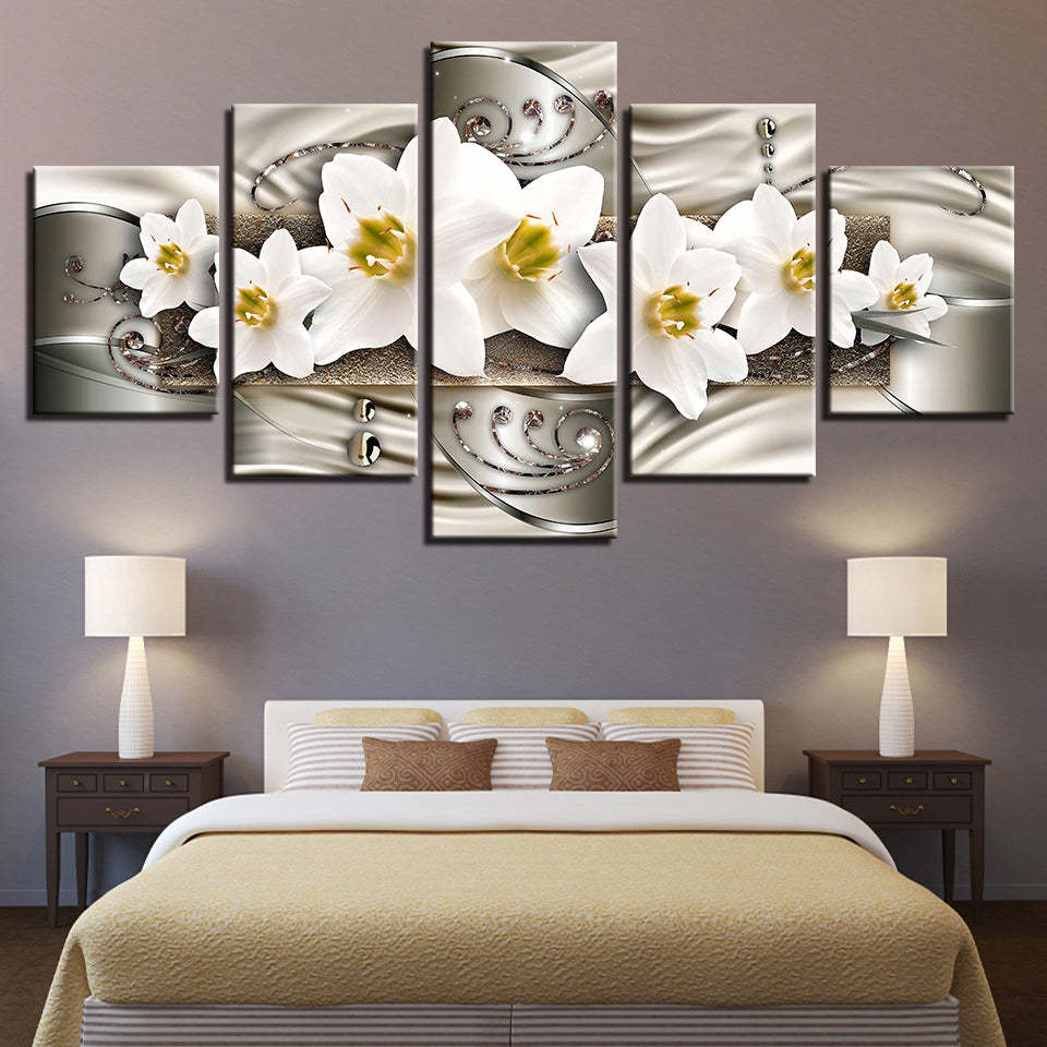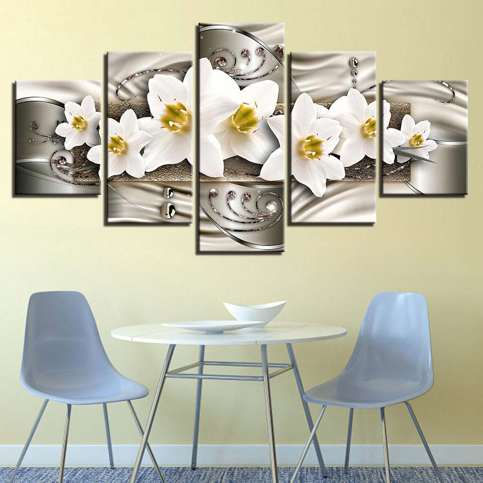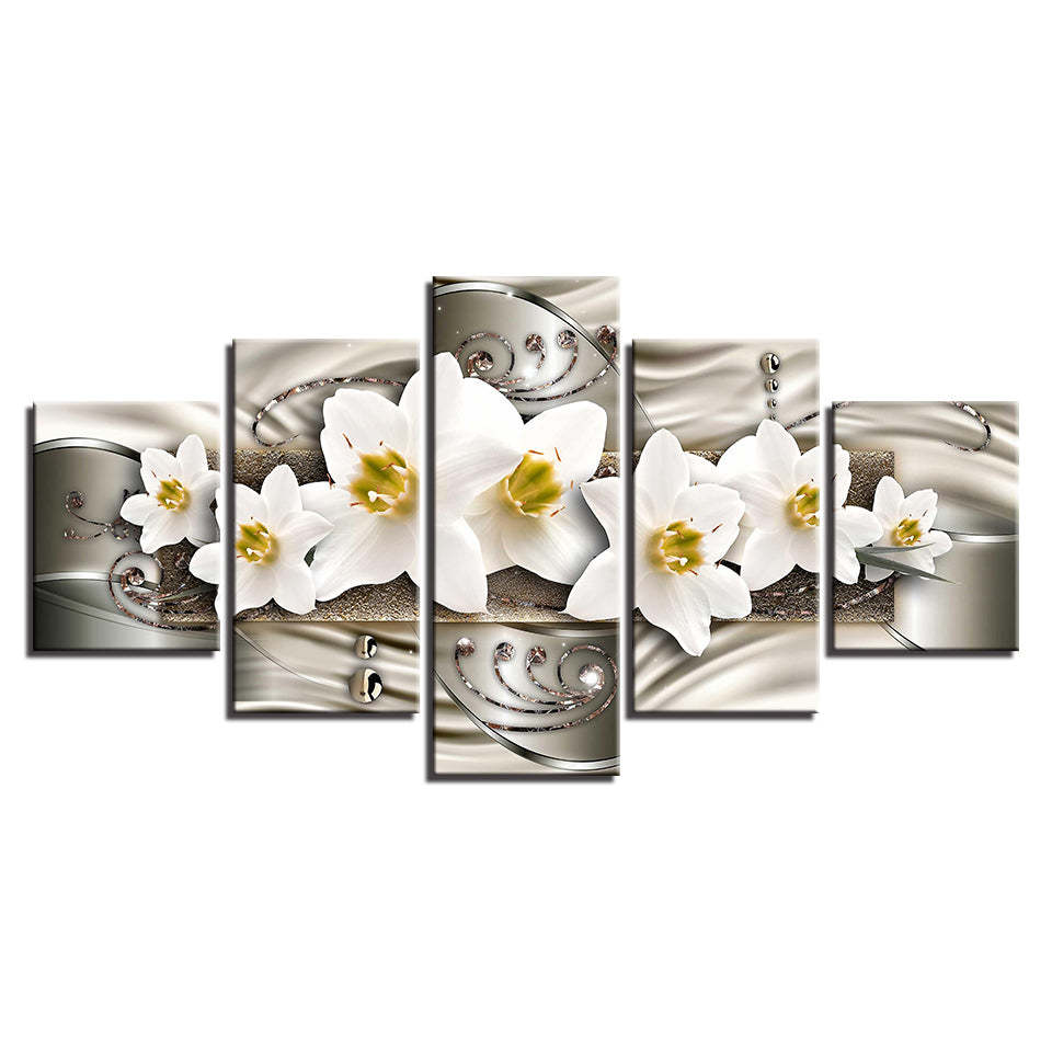 Classy White Flowers 5 Piece - Canvas Wall Art Painting is a premium canvas that adds a peaceful touch to your décor. The canvas features an array of pretty white flowers against classy gray folds.