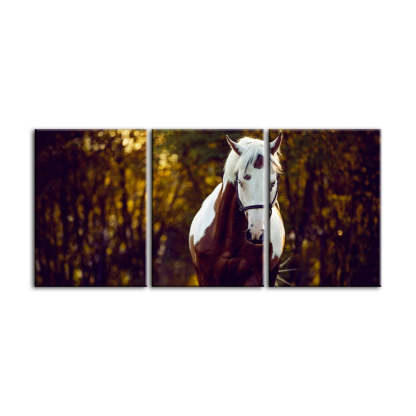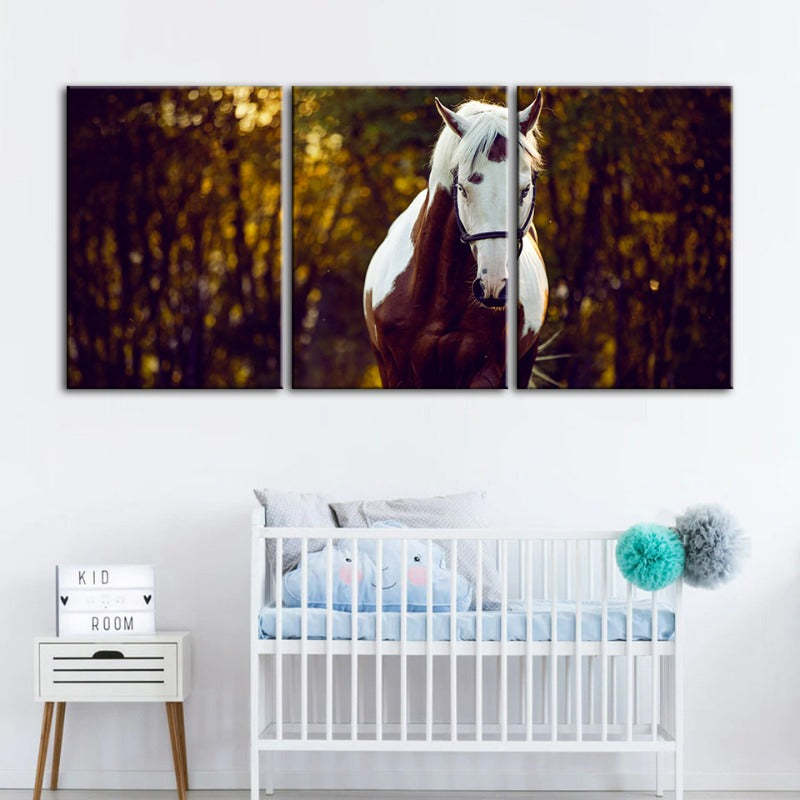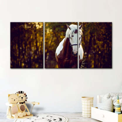 Courtly Overo Horse-Canvas Wall Art Painting 3 Pieces are a premium canvas that adds a peaceful touch to your décor. The canvas features a beautiful brown and white Overo-coated horse, taking a calming stroll through the woods.