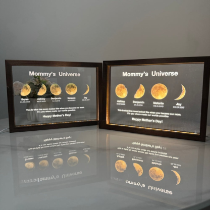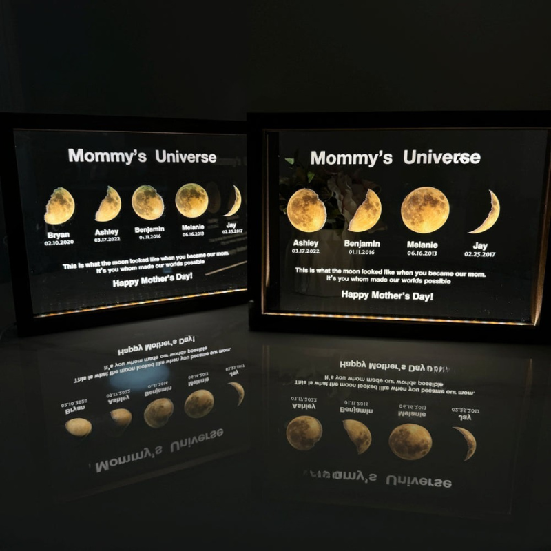 Set in a clear acrylic surface and illuminated with a soft glow, the frame turns memories into a visual story. Every engraving marks a chapter of family growth and personal transformation. Names and dates beneath each moon phase complete the scene with a personal touch.