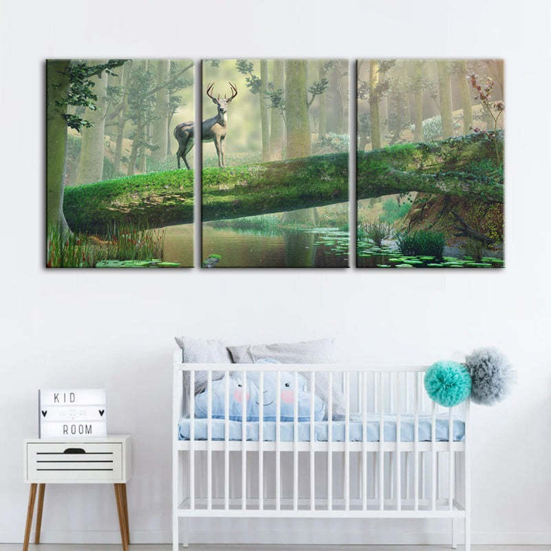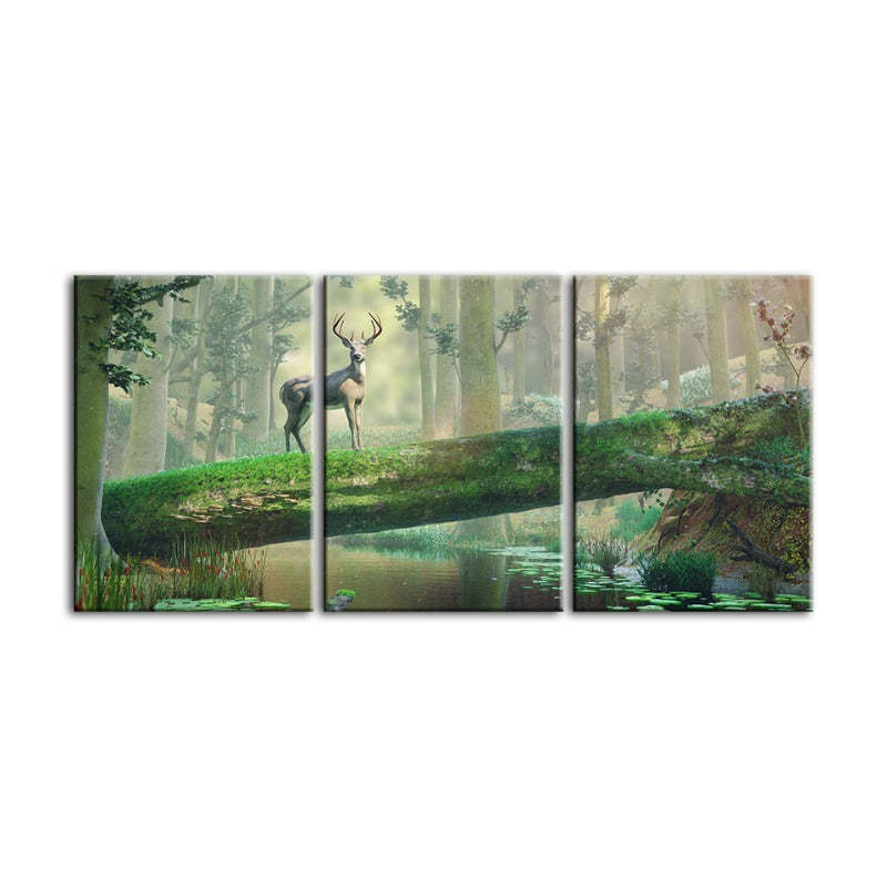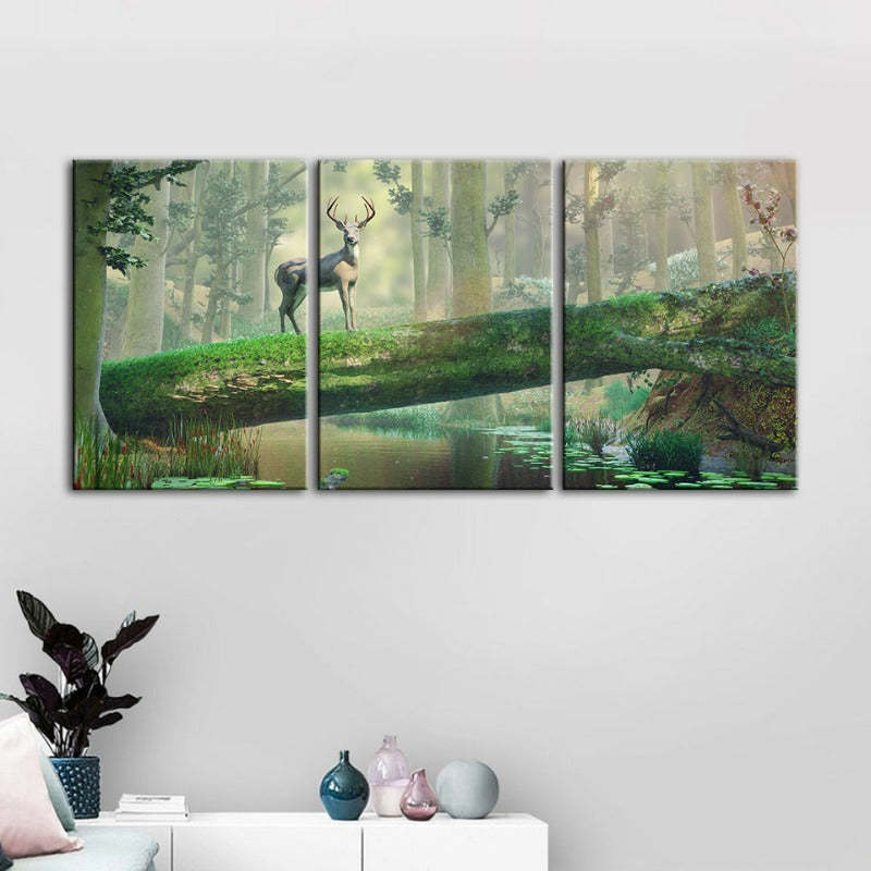 Enchanted Forest Deer-Canvas Wall Art Painting 3 Pieces are a premium canvas that adds a peaceful touch to your décor. The canvas features a deer standing upon a fallen tree trunk, overlooking an enchanting lily pad-filled creek.