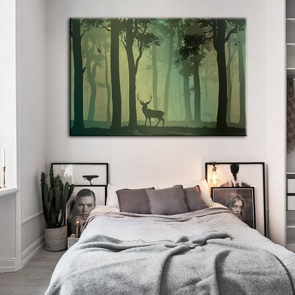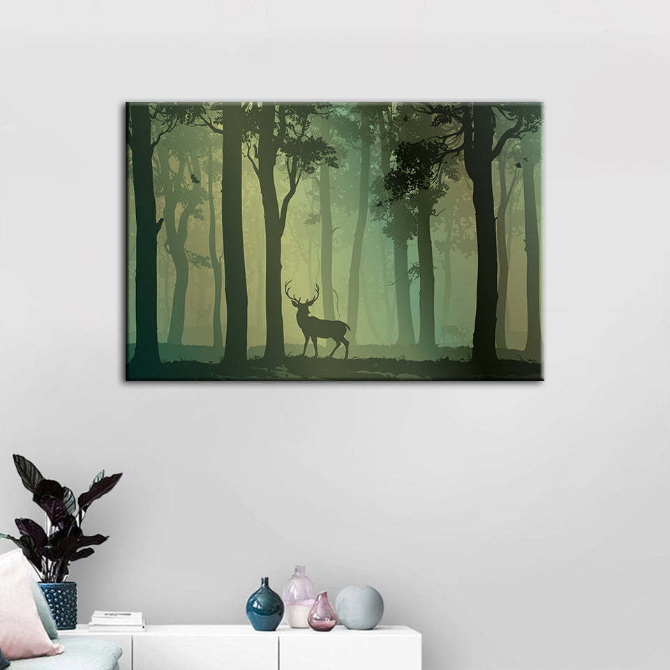 Enchanted Green Toned Silhouetted Deer - Canvas Wall Art Painting is a premium canvas that adds a touch of wildlife art to your décor. The canvas features a green-toned captivating scene of a silhouetted deer in the forest. The Wall Art is perfect to decorate your bedroom, dining room, living room, office, dormitory, hotel lobby, and more! Mix and match your favorite pieces to create an eye-catching feature wall.
