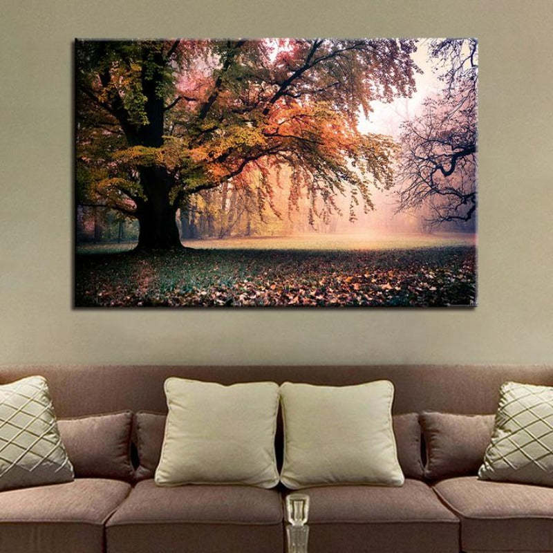 Fall Great Trees - Canvas Wall Art Painting is a premium canvas that adds a touch of nature to your décor. The canvas features a beautiful scene of a tree. Imagine strolling through the deep forest midday, and stumbling across such natural breathtaking beauty. This art work is truly something to behold. The balance of colors and shades evoke a keen sense of calm relaxation. The horizontal asymmetric positioning makes any onlooker contemplate the natural beauty found in the piece. Fits perfectly in any home.