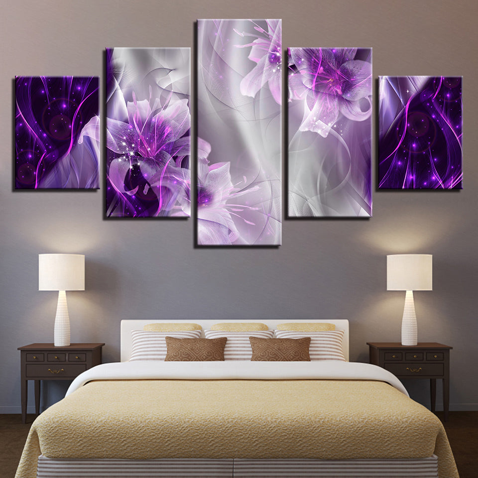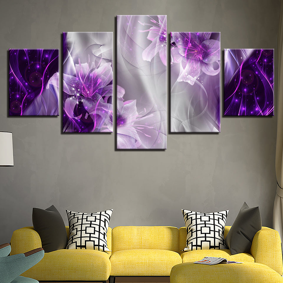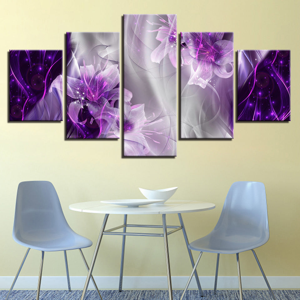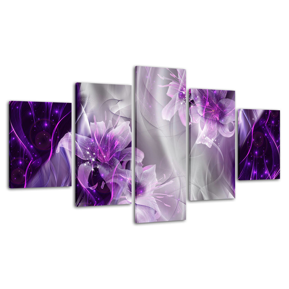 Fantasy Purple Lilies 5 Piece - Canvas Wall Art Painting is a premium canvas that adds a peaceful touch to your décor. The canvas features a whimsical fantasy like the composition of deep glowing purple lilies and swirling smoke.