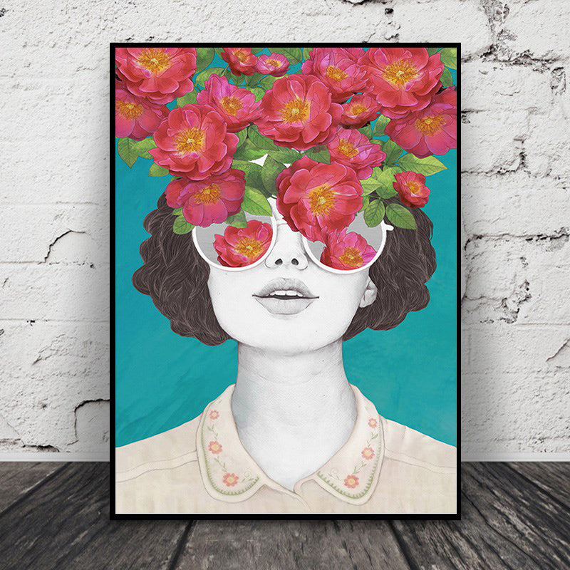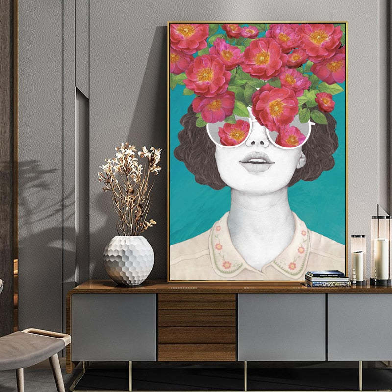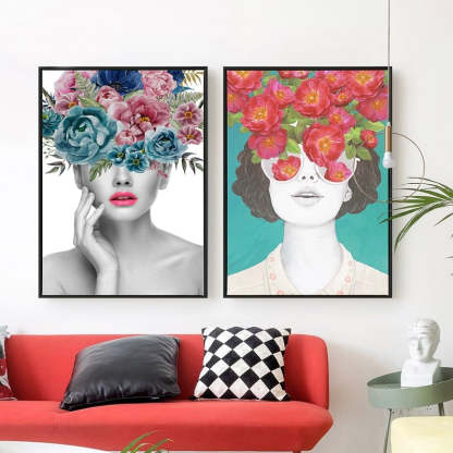 Fashion Figure Floral Girl - Canvas Wall Art Painting features a girl's face with a bunch of flowers on her face, showing a perfect combination of ancient and modern era. These are premium canvas painted with vibrant colors, adding life and enhancing the look of any place. It is also a great idea for a gift for any occasion.