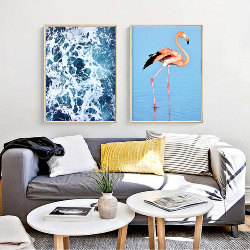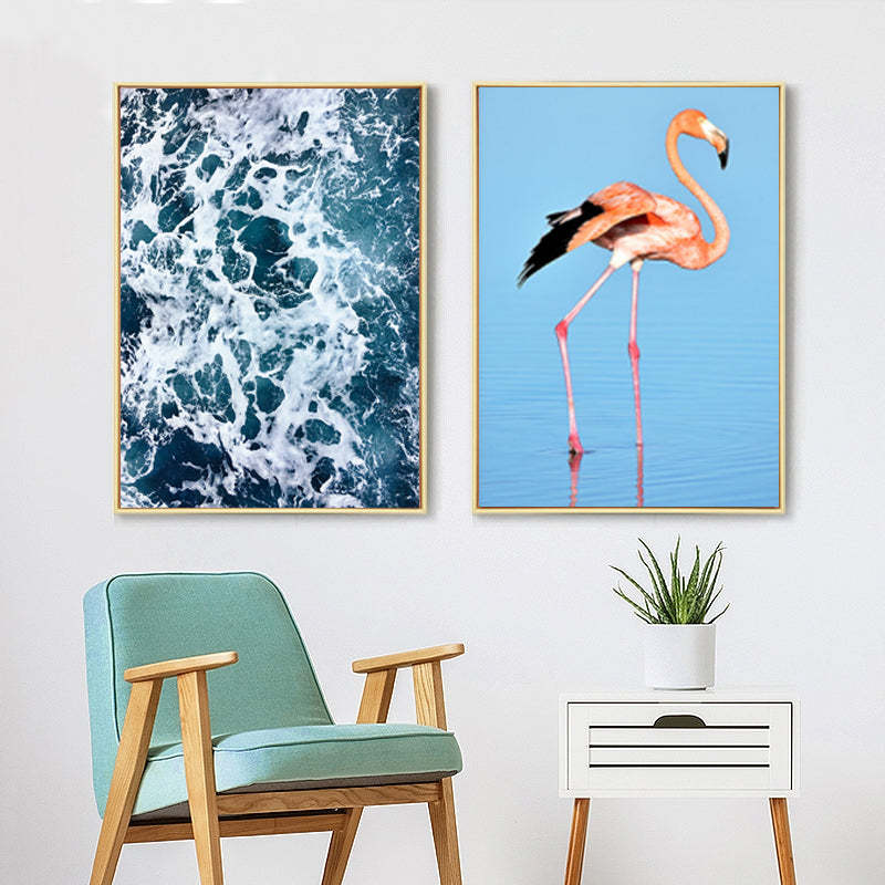 Flamingo In Seascape - Canvas Wall Art Painting is a flamingo in seascape poster with the spray painting technique in a vertical rectangle shape made from canvas material suitable for every living space for Decor, It is available in a variety of designs and abstract shapes making it ideal for gifting in every occasion.
