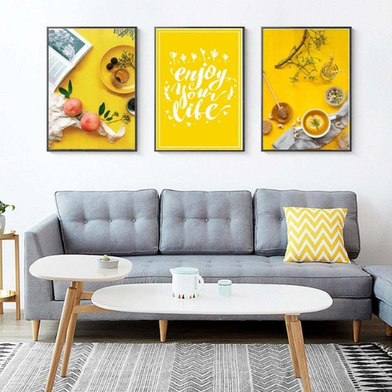 Food Tea Poster Life Quote Yellow Background - Canvas Wall Art Painting is an abstract painted poster that comes without a frame, made from waterproof Ink with the spray painting technique in a vertical rectangle shape made from canvas material suitable for every living space for Decor, It is available in a variety of designs making it ideal for gifting in every occasion.