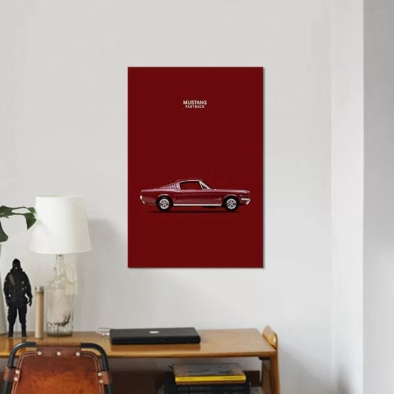 Ford Mustang Fastback - Canvas Wall Art Painting is a premium canvas that adds a touch of the road life vibe to your décor. The canvas features a dark red car in an all red background. It's a great statement piece for anyone who loves cars.