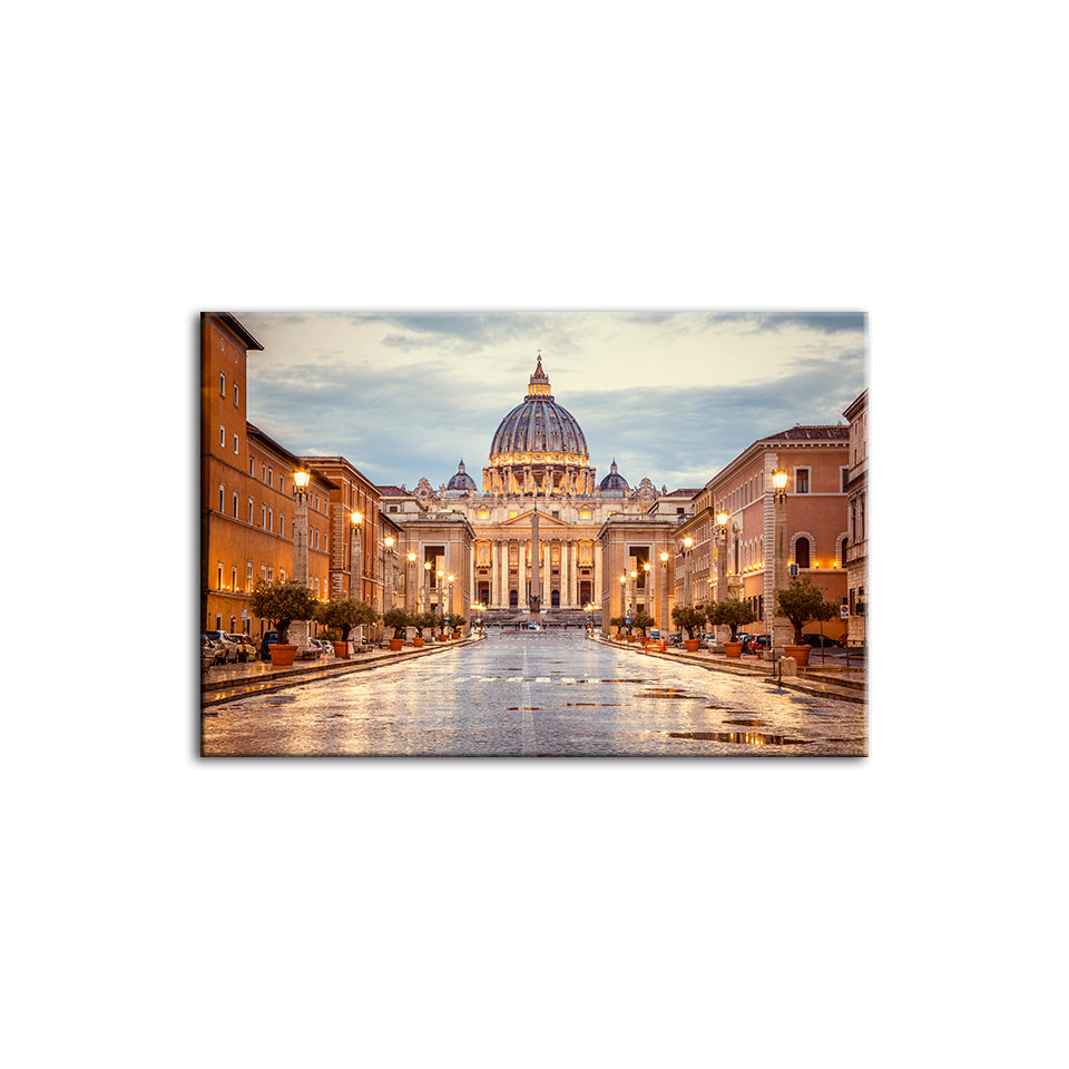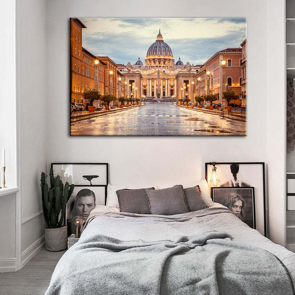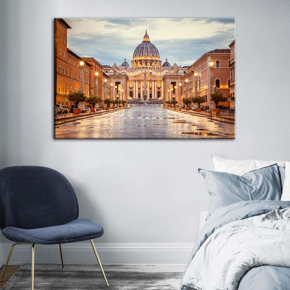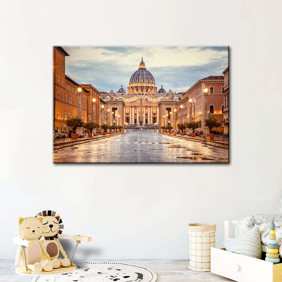 Fresh Palace - Canvas Wall Art Painting is a premium canvas that adds a class touch to your decor. The canvas features the front view of a royal palace near an empty raining street.