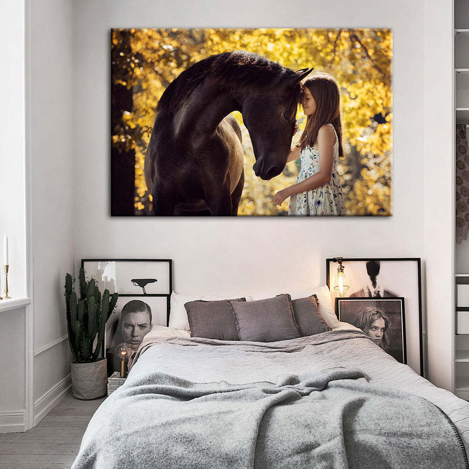Friendship Between a Girl and Horse - Canvas Wall Art Painting is a premium canvas that adds a touch of natural friendship art to your décor. The canvas features the beautiful bond between a young girl and her horse. The Wall Art is perfect to decorate your bedroom, dining room, living room, office, dormitory, hotel lobby, and more! Mix and match your favorite pieces to create an eye-catching feature wall.