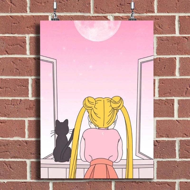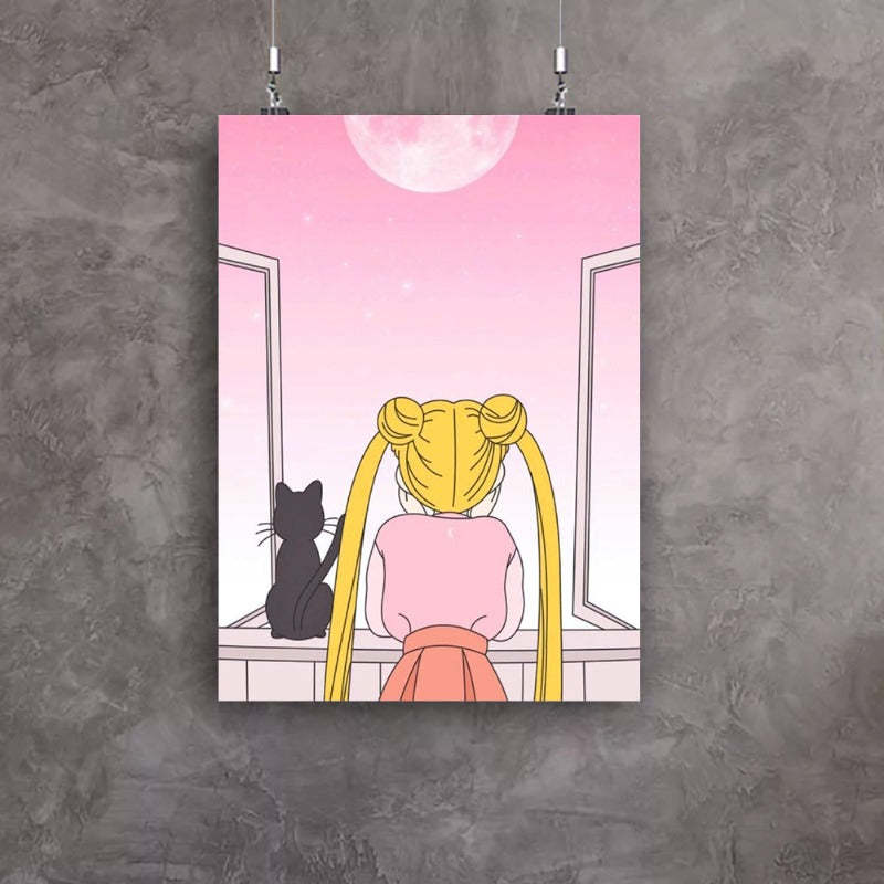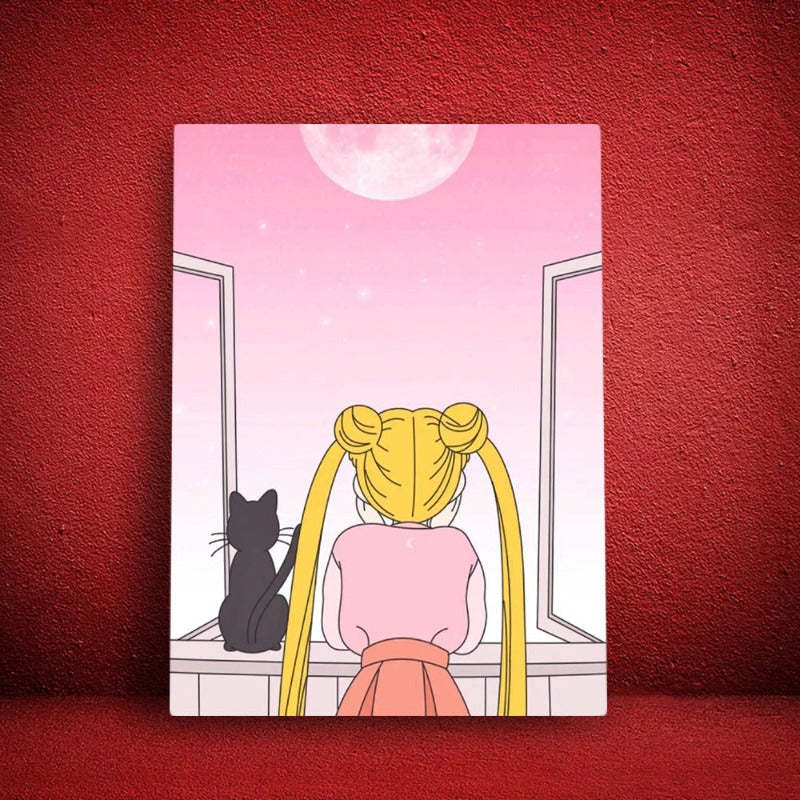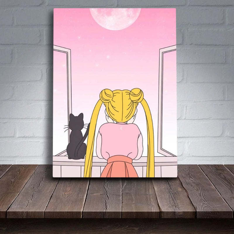 Girl And Her Moon Cat - Canvas Wall Art Painting is a premium canvas that adds a little touch of fantasy anime to your décor. The canvas features a girl with blonde pigtails sitting at a window with her cat. The symmetrical layout provides a calming, relaxing feeling to anyone who decides to look. This is great to put in a spot in your house.