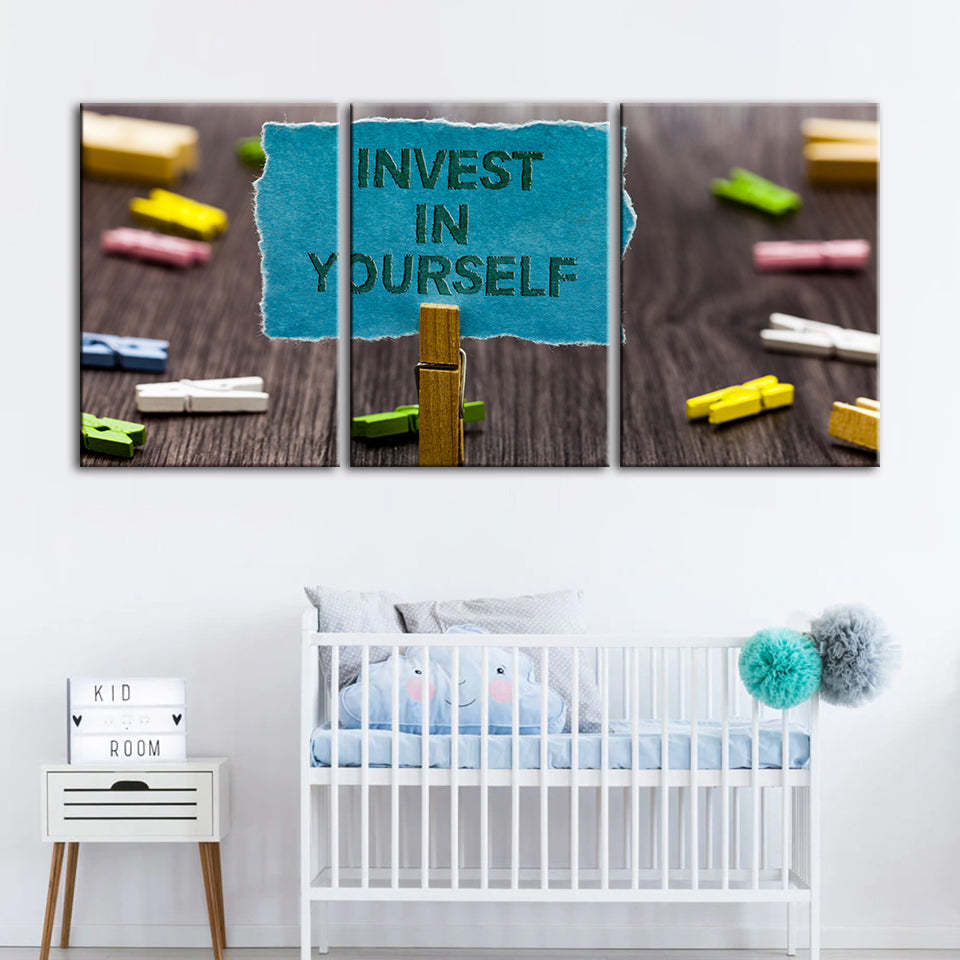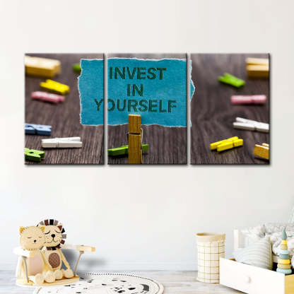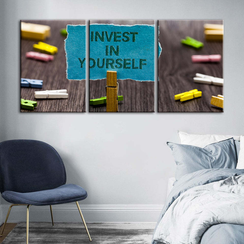 Invest In Yourself 3 Piece - Canvas Wall Art Painting is a premium canvas that adds a motivating touch to your decor. The canvas features a bunch of note pins on a table with one pinned note reading "Invest In Yourself" that you can hang on your wall.