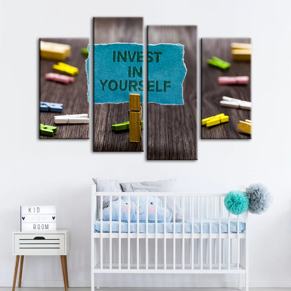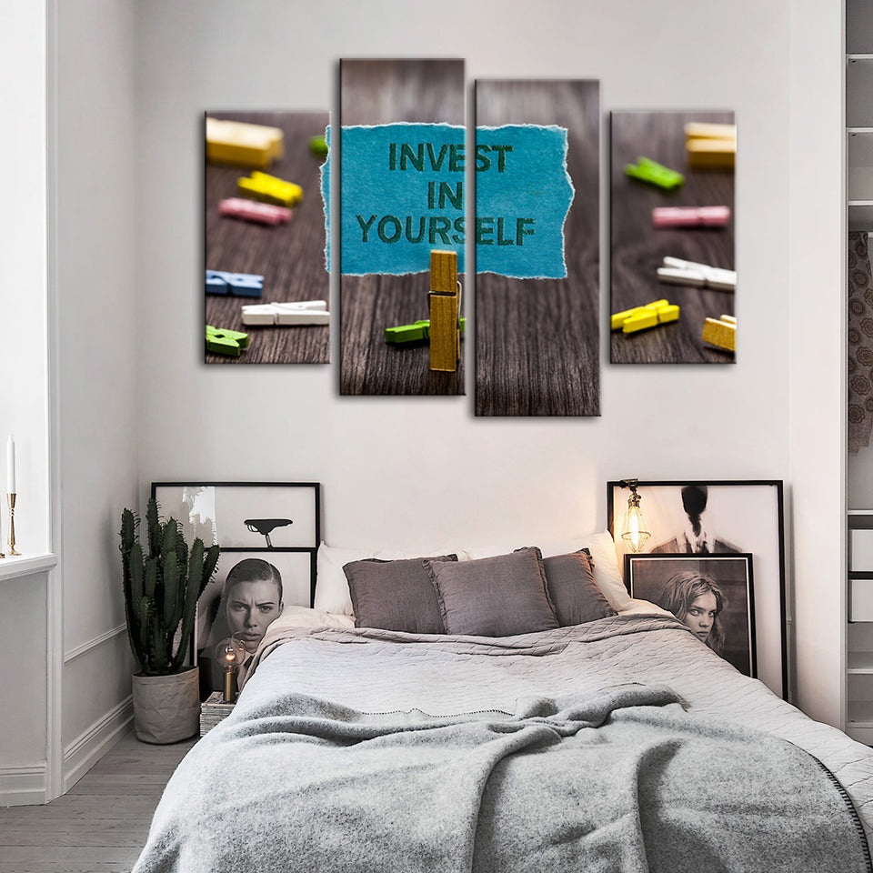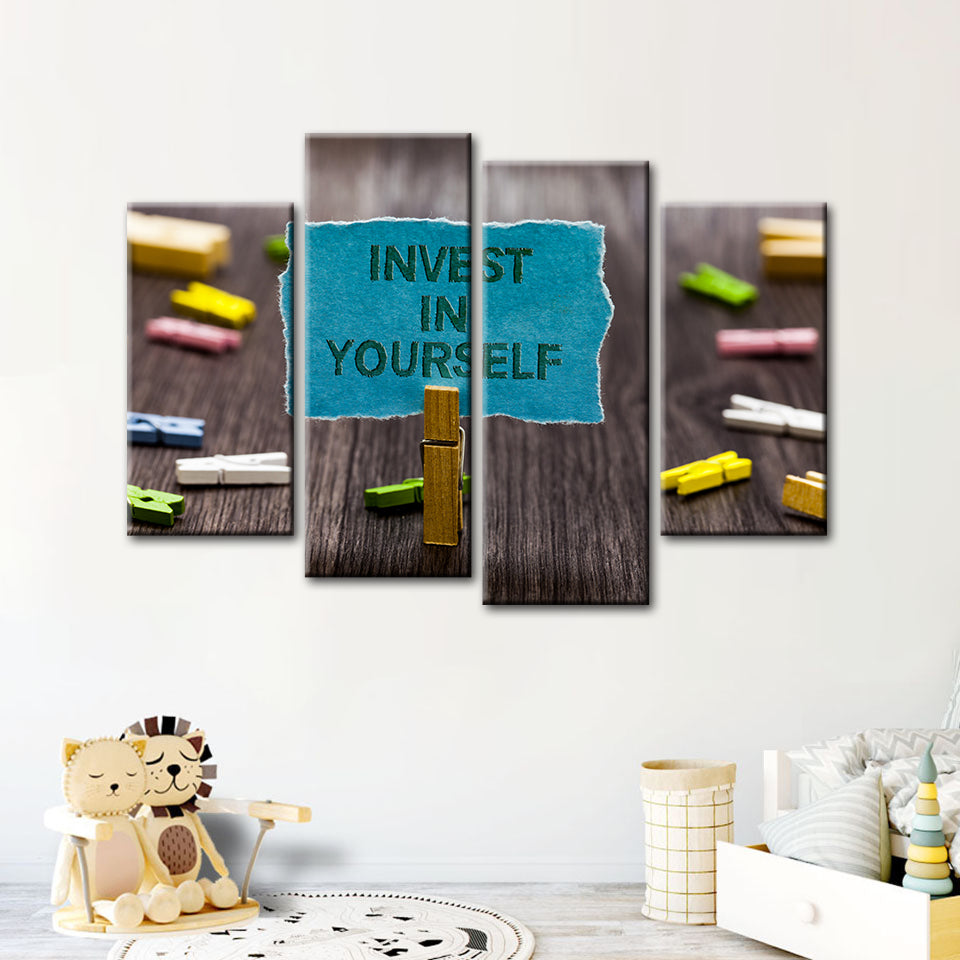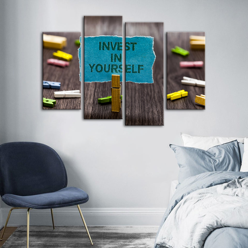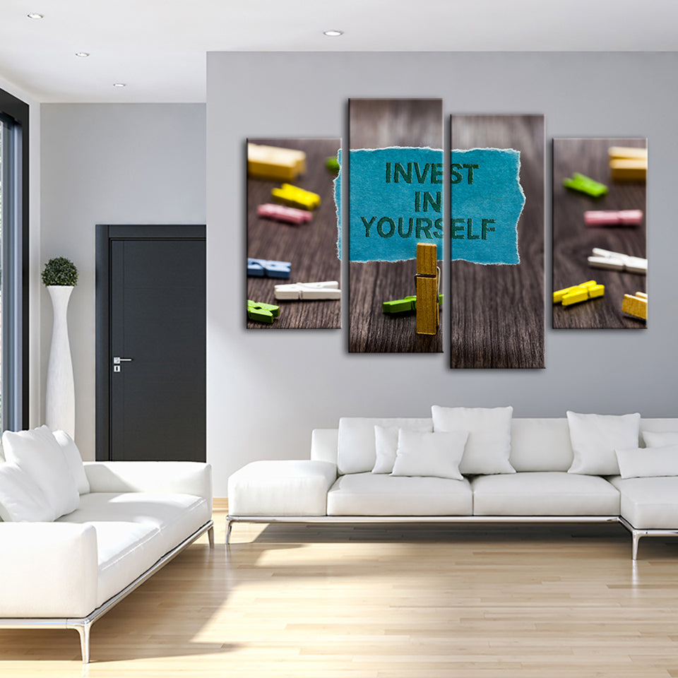 Invest In Yourself 4 Piece - Canvas Wall Art Painting is a premium canvas that adds a motivating touch to your decor. The canvas features a bunch of note pins on a table with one pinned note reading "Invest In Yourself" that you can hang on your wall.