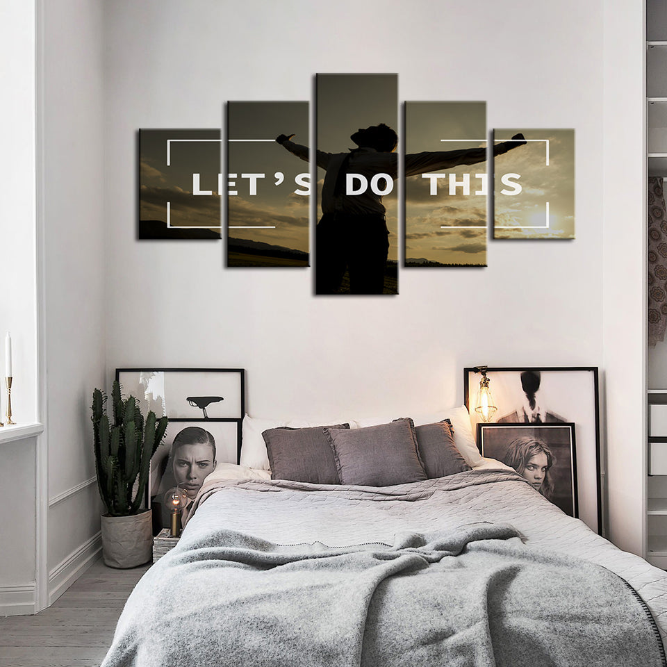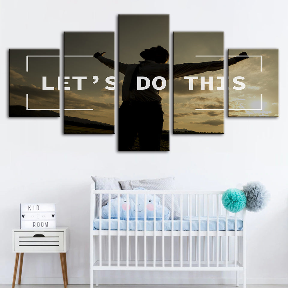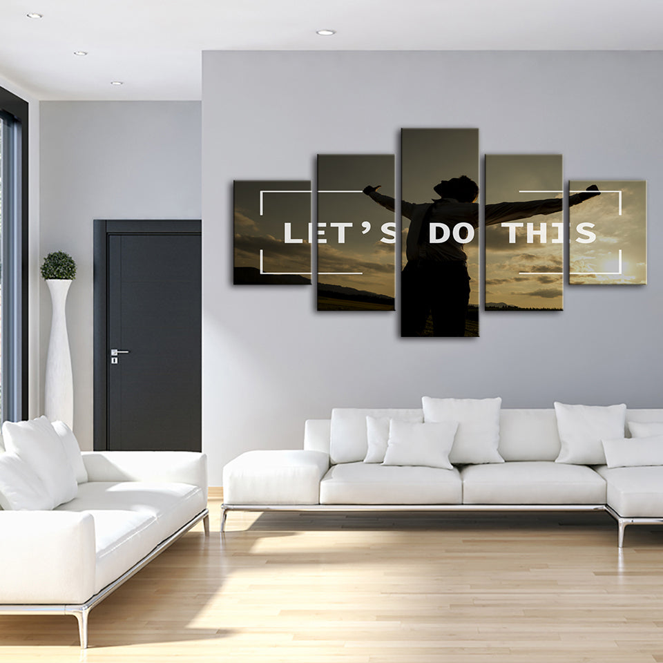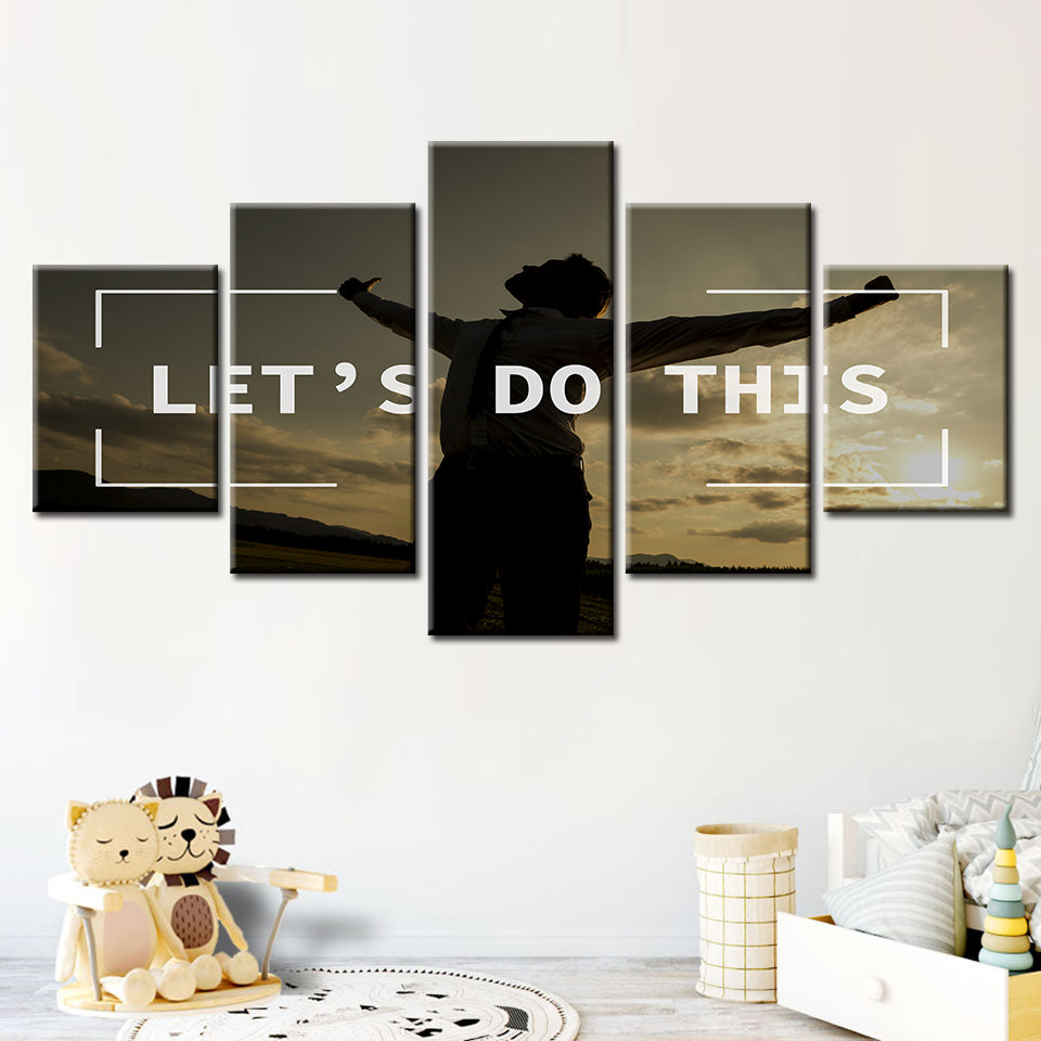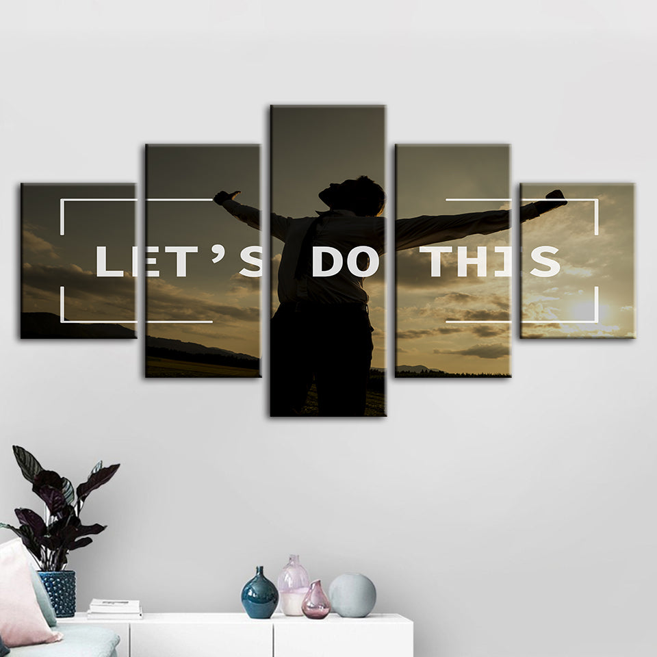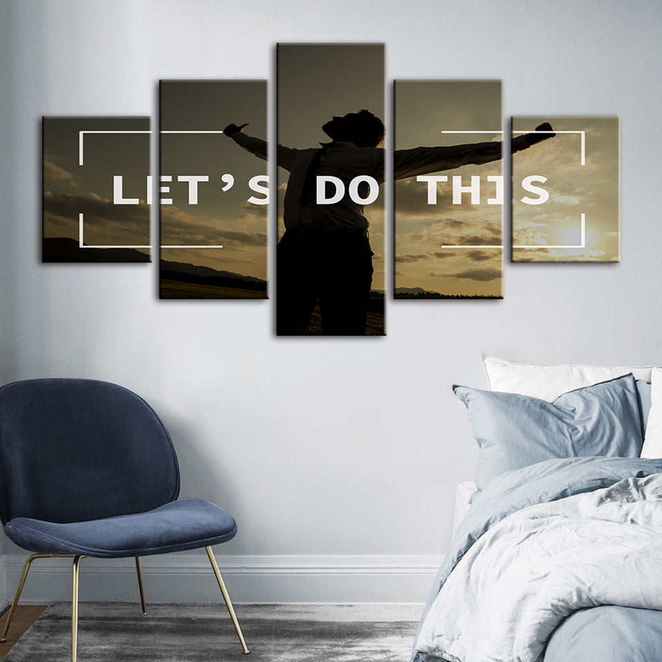 Let's Do This 5 Piece - Canvas Wall Art Painting is a premium canvas that adds a motivating touch to your decor. The canvas features a person standing with their arms wide open with the words "Let's Do This" written.