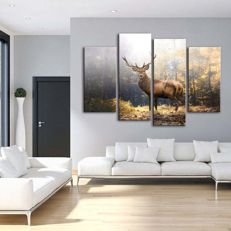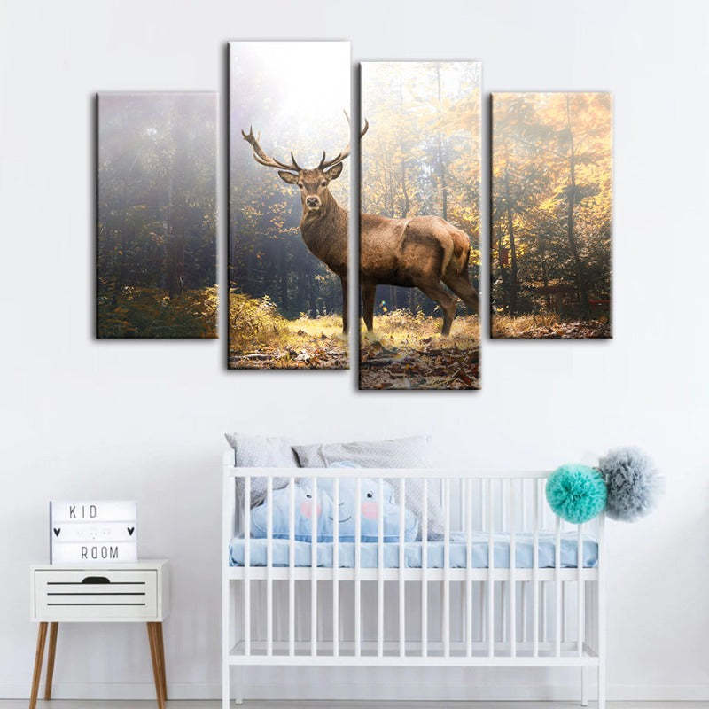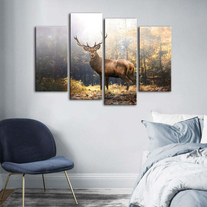 Majestic Deer in the Woods 4 Piece - Canvas Wall Art Painting is a premium canvas that adds a peaceful touch to your décor. The canvas features a majestic large deer, haloed by light in a clearing in the woods.